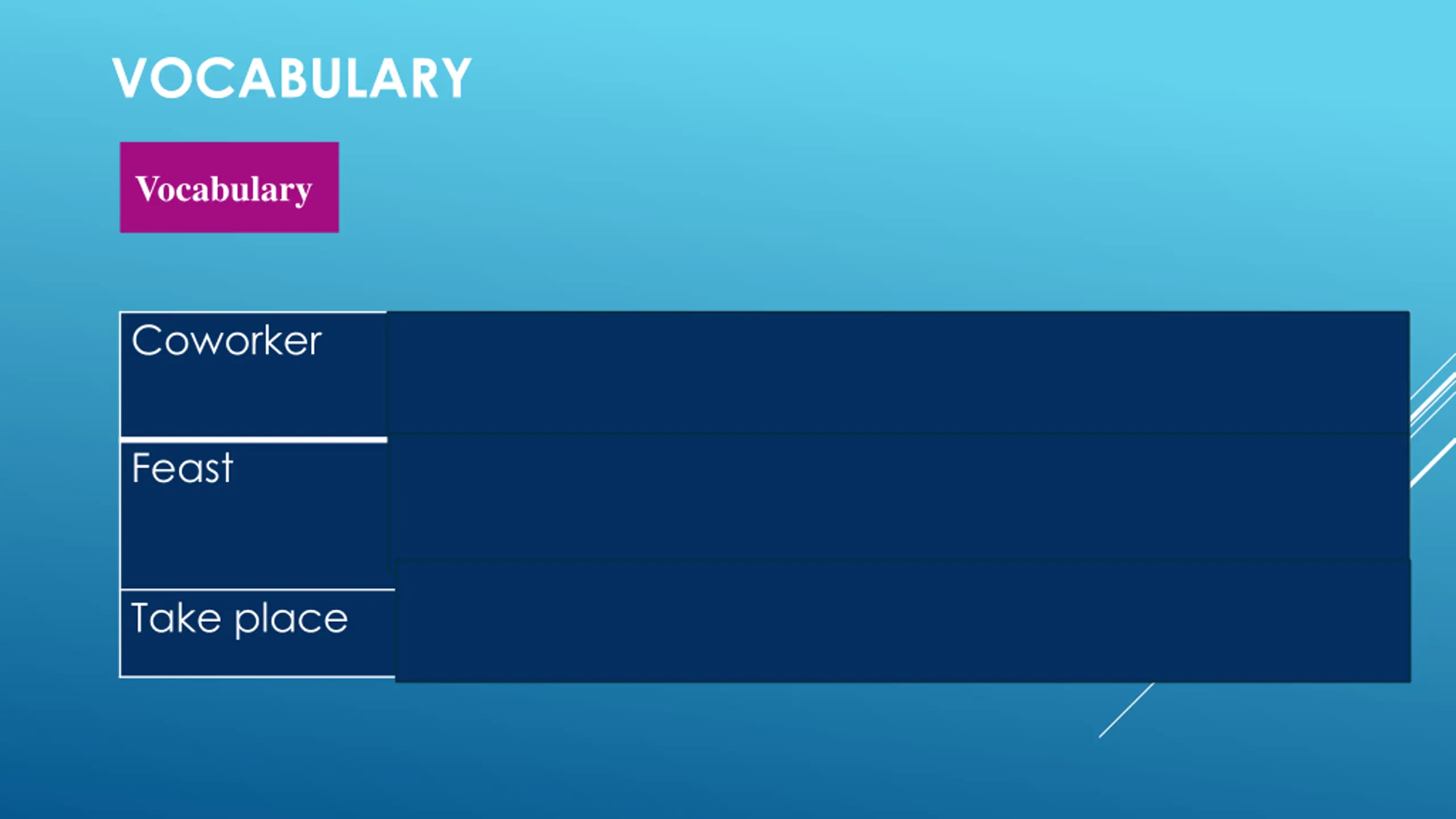 VOCABULARY Vocabulary Coworker a person who you work with, with a similar job Feast a a large meal for many people special meal with very good food or Take place Happen