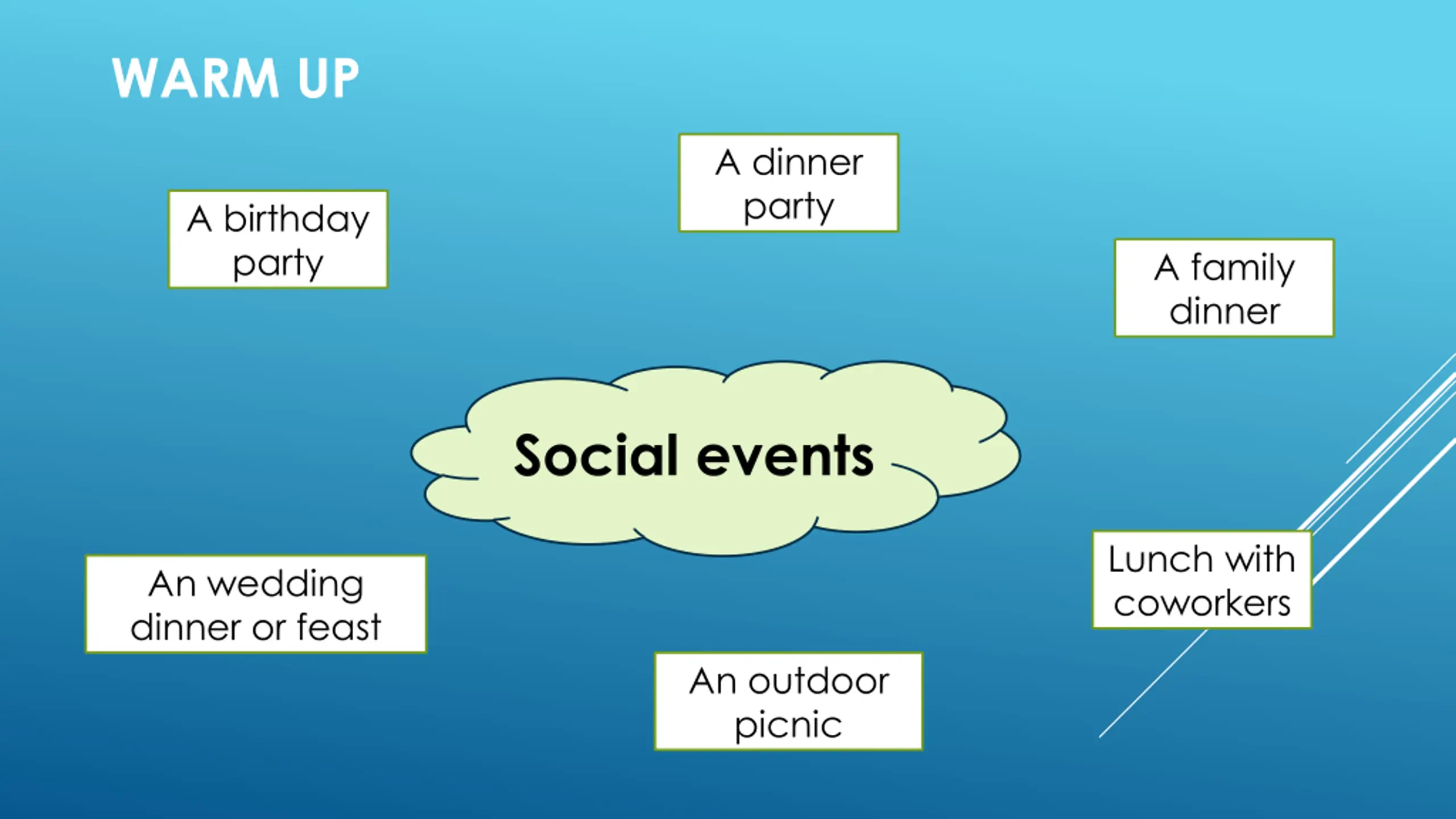 WARM UP A dinner party A birthday party A family dinner Social events Lunch with coworkers An wedding dinner or feast An outdoor picnic
