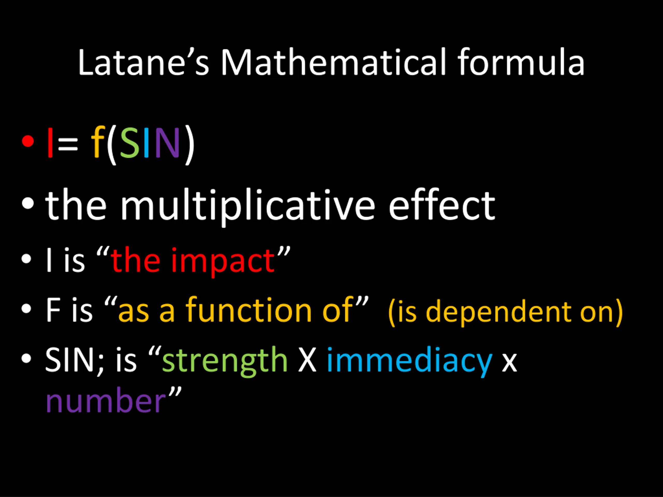 Latanes Mathematical formula I= f(SIN) the multiplicative effect I is the impact F is as a function of (is dependent on) SIN; is strength X immediacy x number