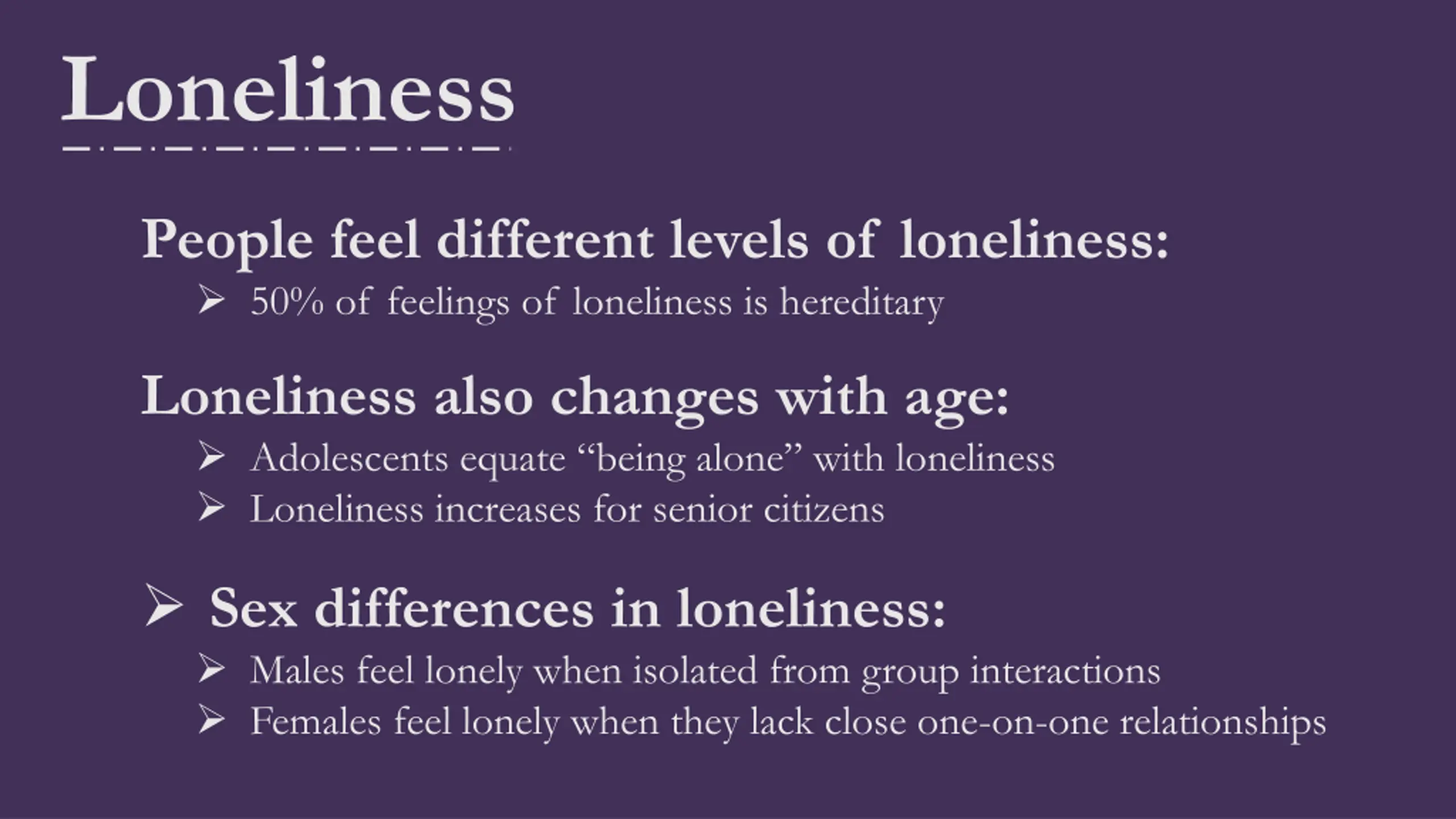 Loneliness People feel different levels of loneliness: 50% of feelings of loneliness is hereditary Loneliness also changes with age: Adolescents equate being alone with loneliness Loneliness increases for senior citizens Sex differences in loneliness: Males feel lonely when isolated from group interactions Females feel lonely when they lack close one-on-one relationships
