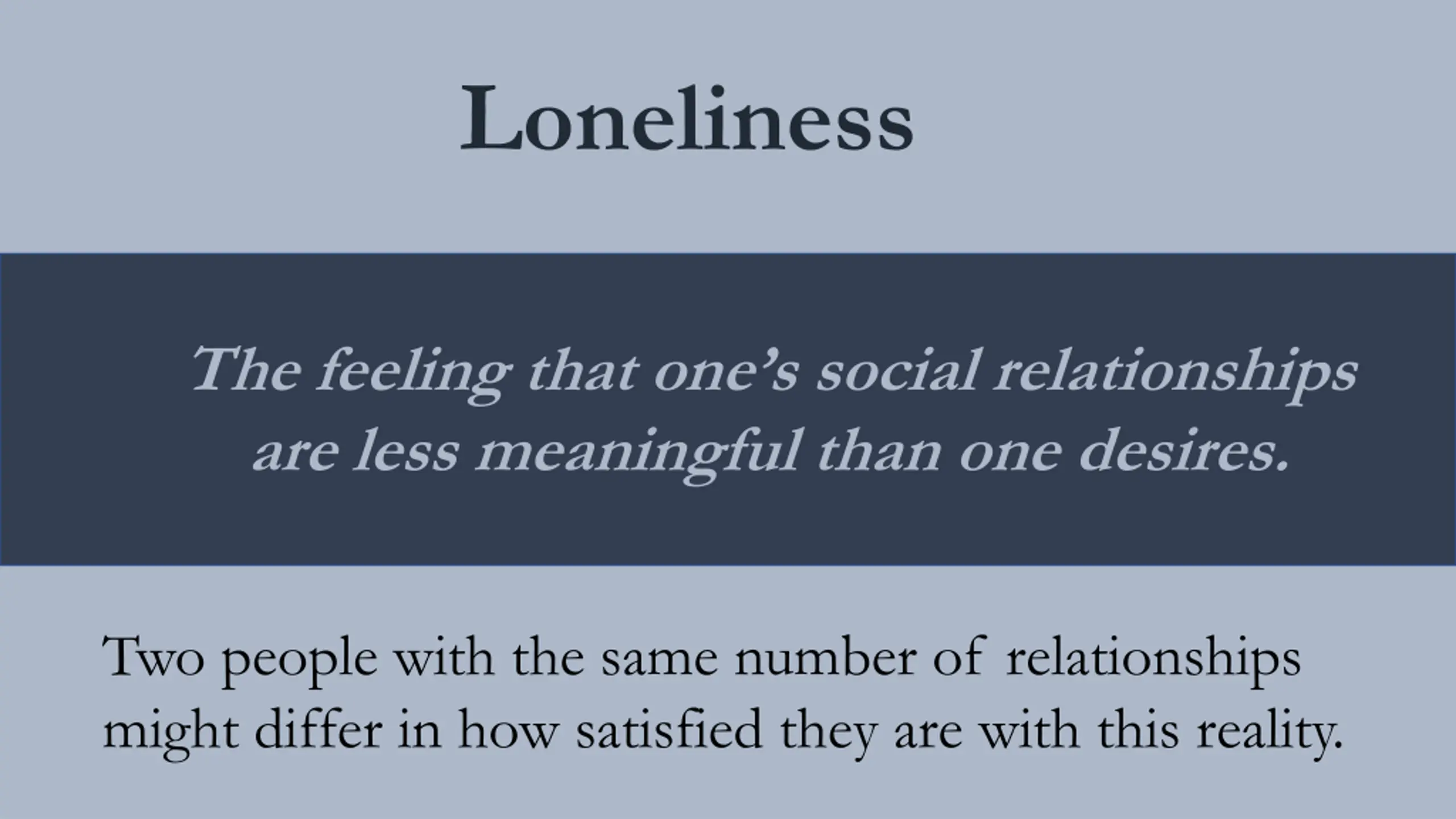 Loneliness The feeling that one s social relationships are less meaningful than one desires. Two people with the same number of relationships might differ in how satisfied they are with this reality.