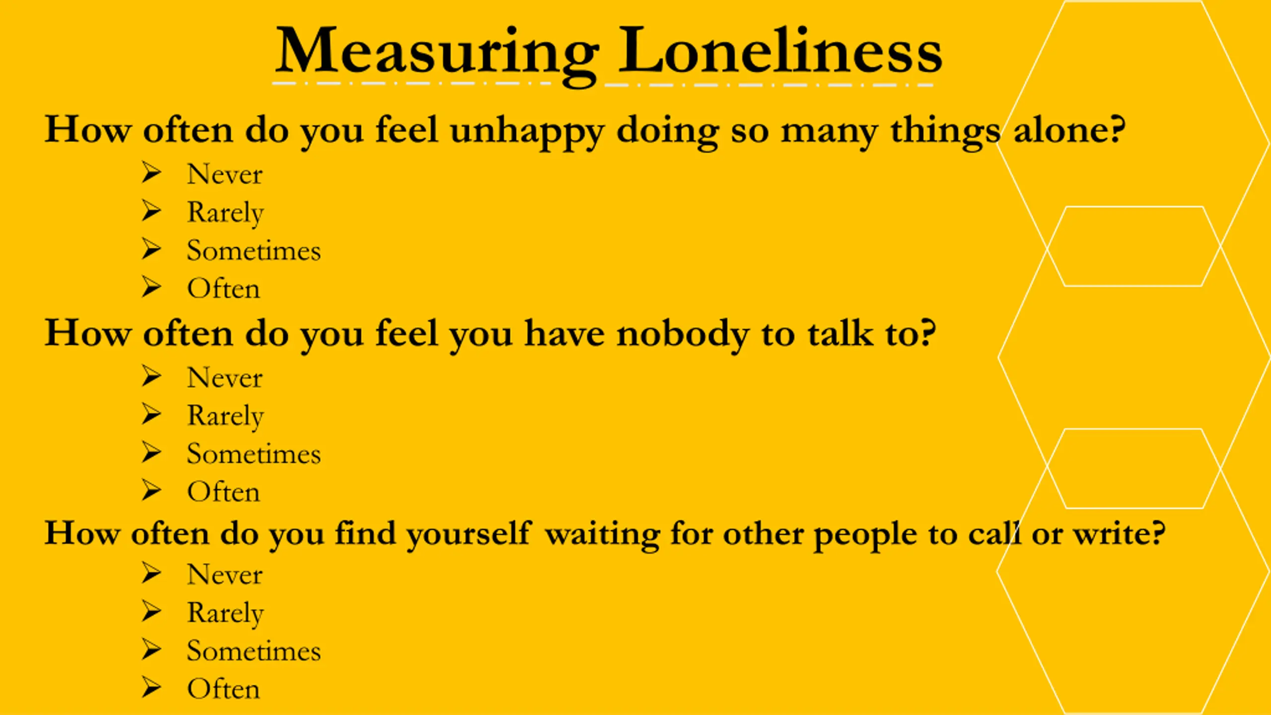 Measuring Loneliness How often do you feel unhappy doing so many things alone? Never Rarely Sometimes Often How often do you feel you have nobody to talk to? Never Rarely Sometimes Often How often do you find yourself waiting for other people to call or write? Never Rarely Sometimes Often