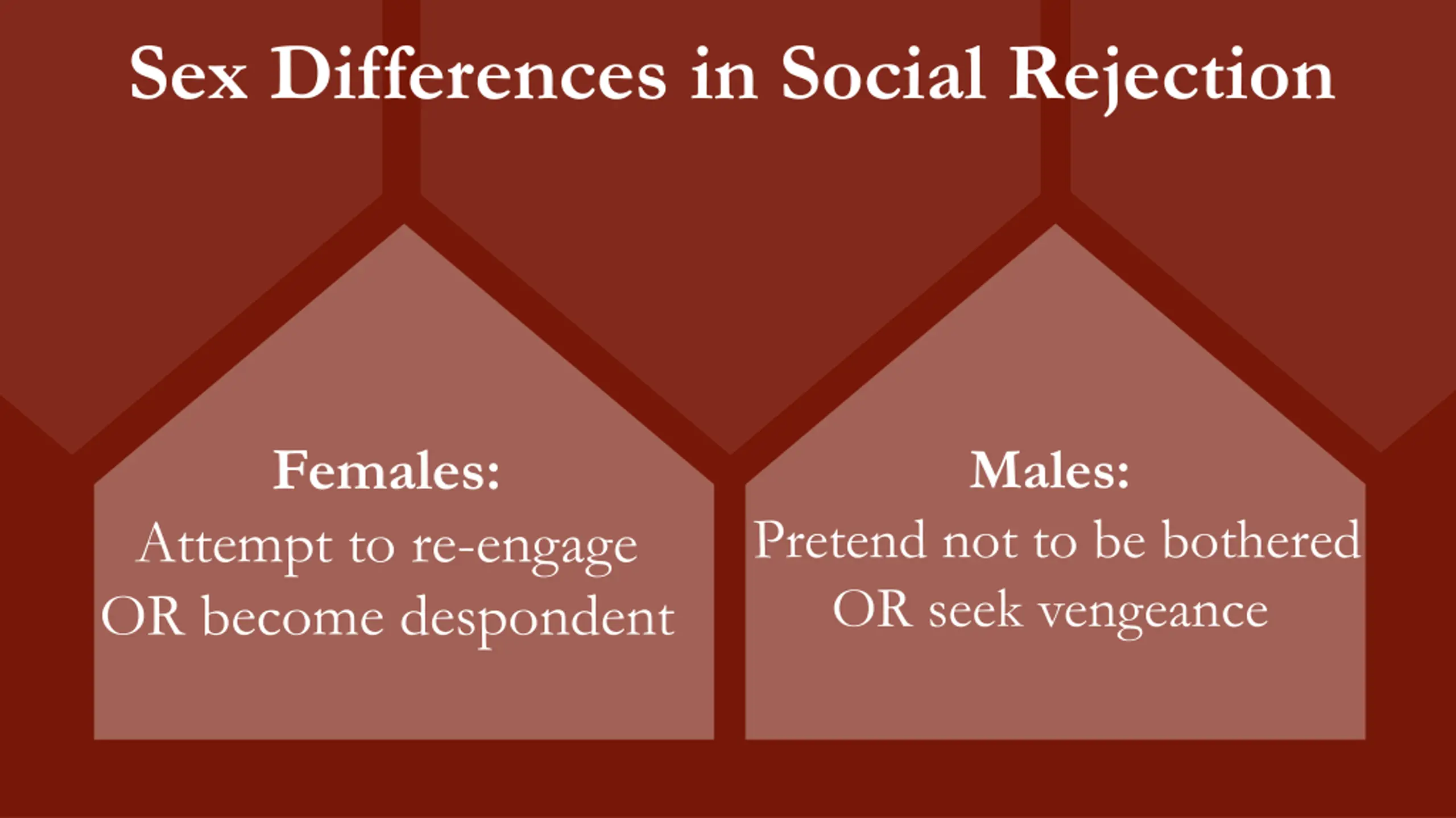 Sex Differences in Social Rejection Females: Males: Pretend not to be bothered OR seek vengeance Attempt to re-engage OR become despondent