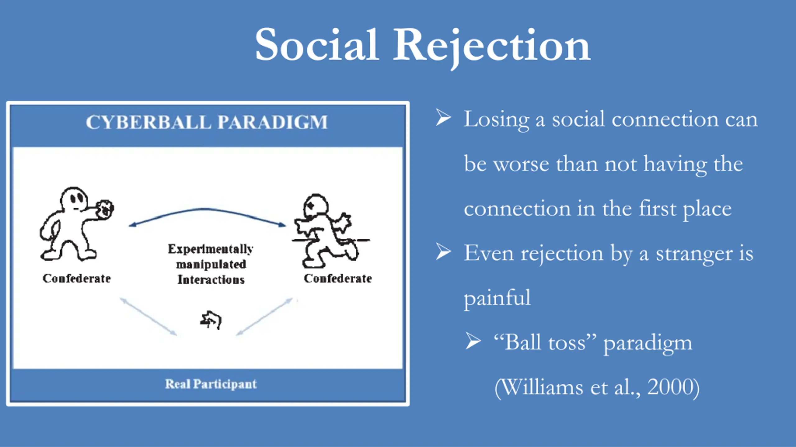 Social Rejection Losing a social connection can be worse than not having the connection in the first place Even rejection by a stranger is painful Ball toss paradigm (Williams et al., 2000)
