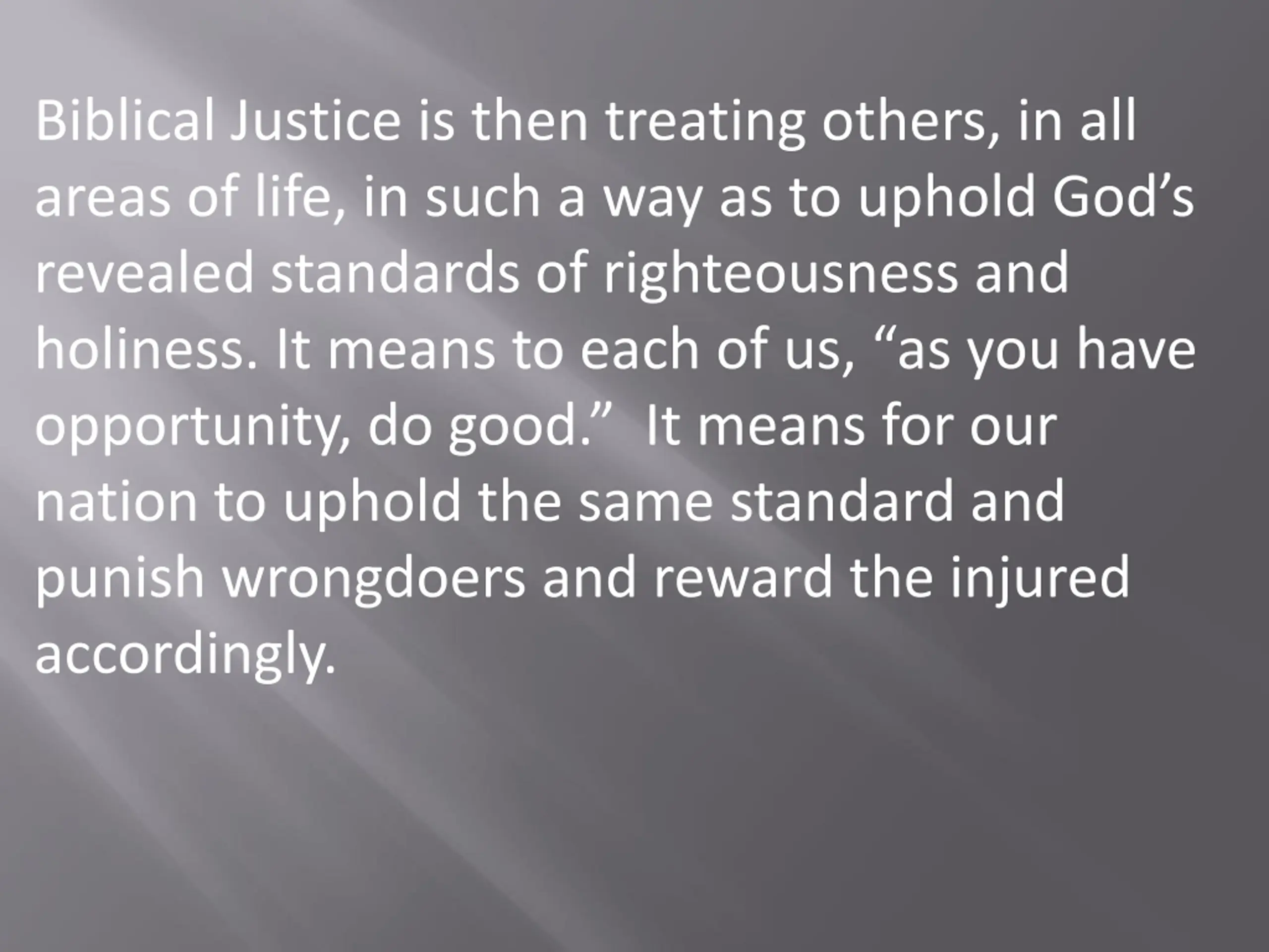 Biblical Justice is then treating others, in all areas of life, in such a way as to uphold God s revealed standards of righteousness and holiness. It means to each of us, as you have opportunity, do good. It means for our nation to uphold the same standard and punish wrongdoers and reward the injured accordingly.