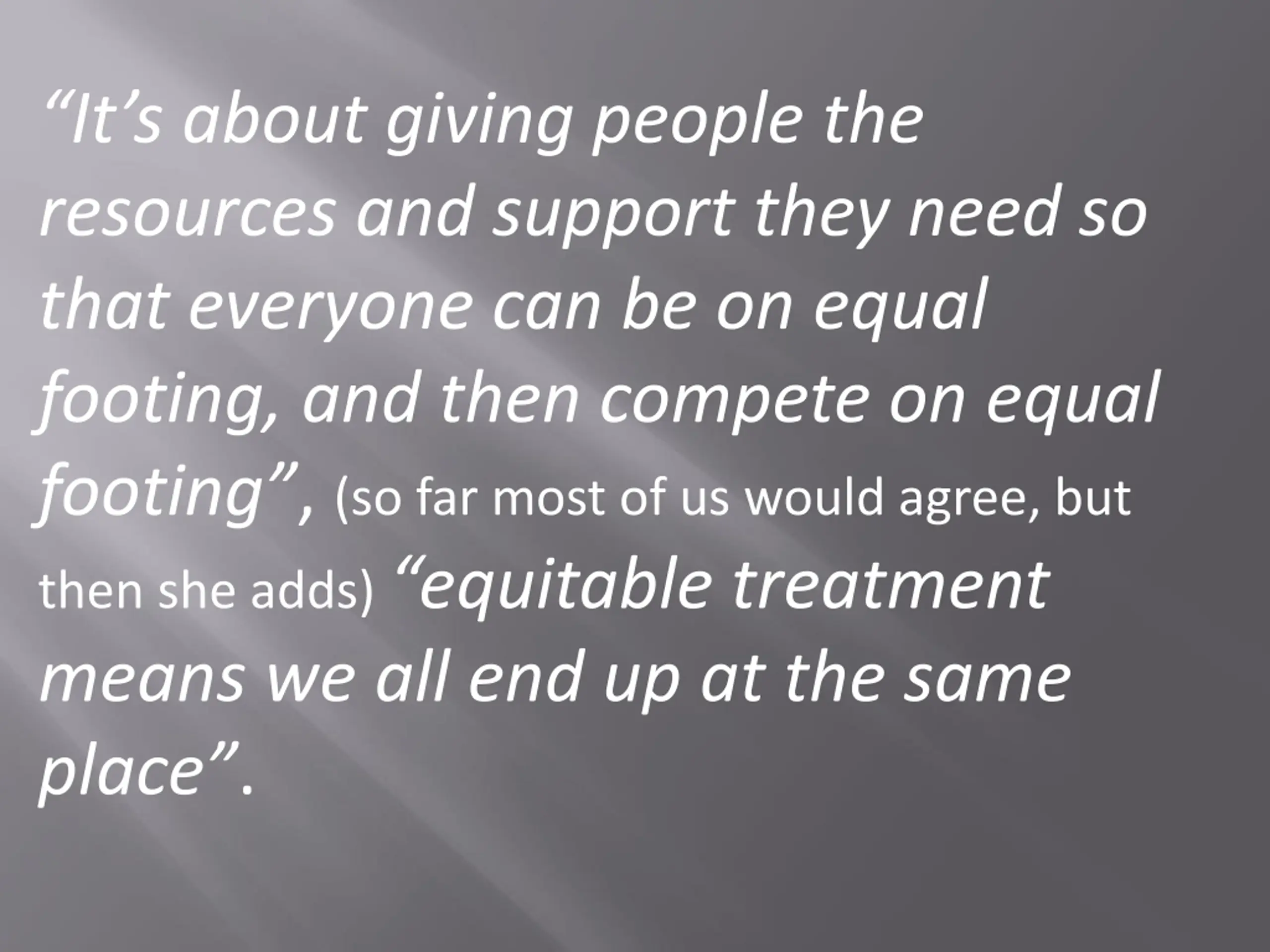 Its about giving people the resources and support they need so that everyone can be on equal footing, and then compete on equal footing , (so far most of us would agree, but then she adds) equitable treatment means we all end up at the same place .