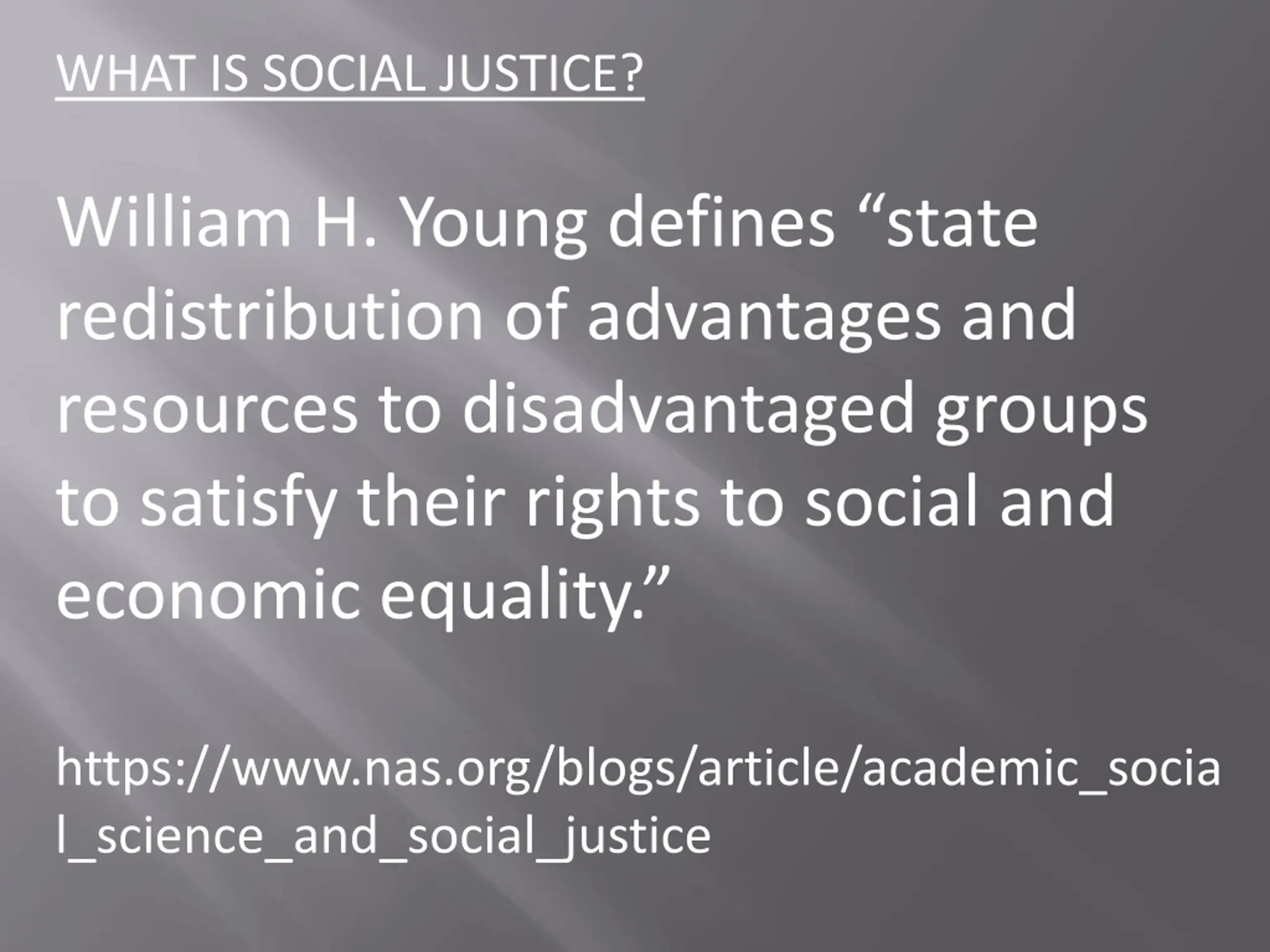 WHAT IS SOCIAL JUSTICE? William H. Young defines state redistribution of advantages and resources to disadvantaged groups to satisfy their rights to social and economic equality. https://www.nas.org/blogs/article/academic_socia l_science_and_social_justice