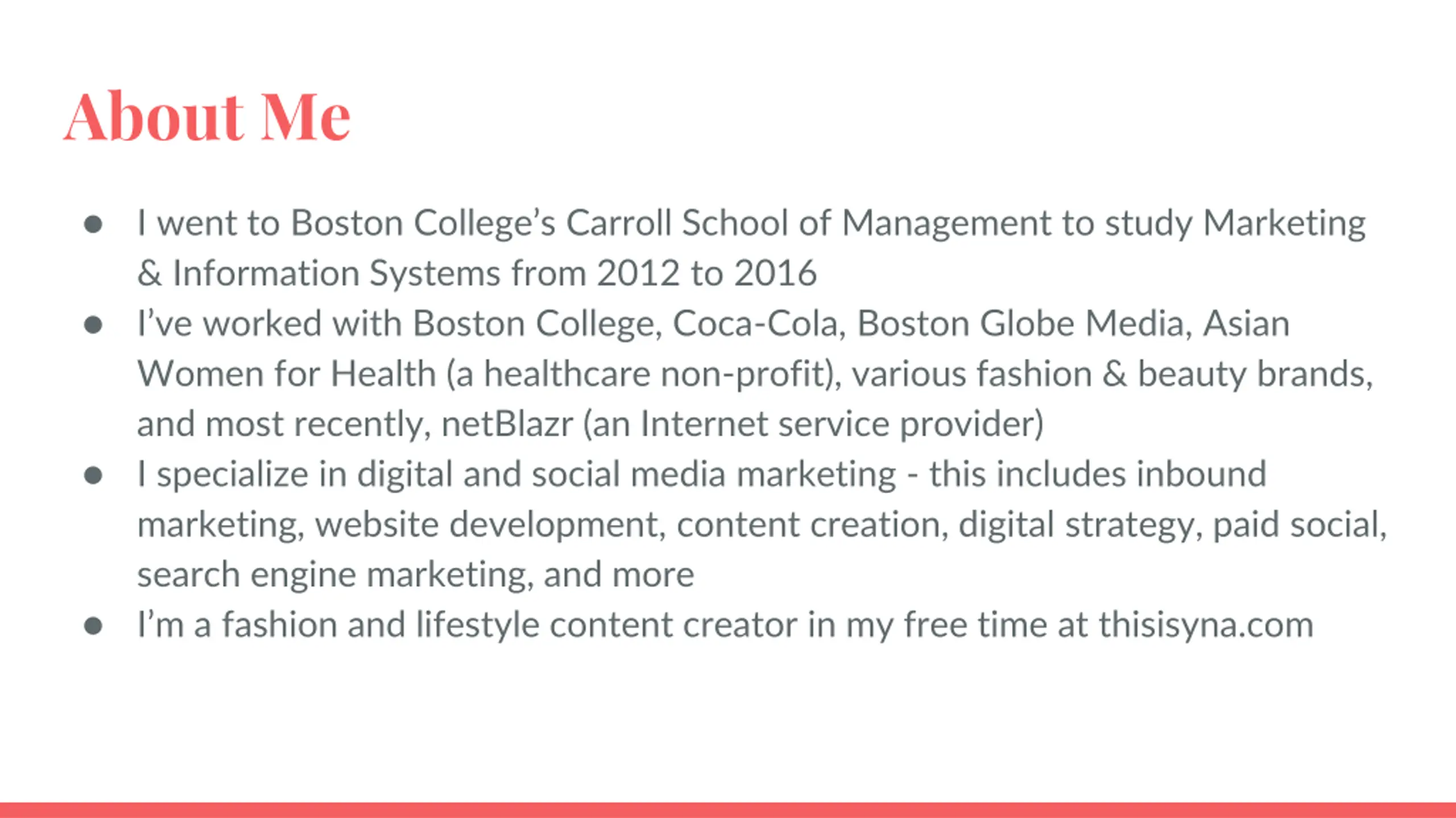 About Me I went to Boston College s Carroll School of Management to study Marketing & Information Systems from 2012 to 2016 I ve worked with Boston College, Coca-Cola, Boston Globe Media, Asian Women for Health (a healthcare non-profit), various fashion & beauty brands, and most recently, netBlazr (an Internet service provider) I specialize in digital and social media marketing - this includes inbound marketing, website development, content creation, digital strategy, paid social, search engine marketing, and more I m a fashion and lifestyle content creator in my free time at thisisyna.com