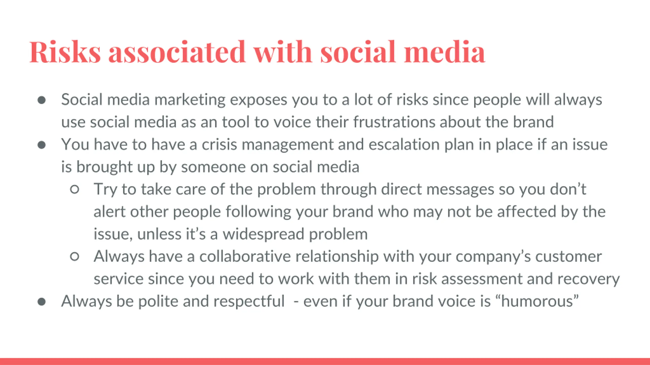 Risks associated with social media Social media marketing exposes you to a lot of risks since people will always use social media as an tool to voice their frustrations about the brand You have to have a crisis management and escalation plan in place if an issue is brought up by someone on social media Try to take care of the problem through direct messages so you don t alert other people following your brand who may not be affected by the issue, unless it s a widespread problem Always have a collaborative relationship with your company s customer service since you need to work with them in risk assessment and recovery Always be polite and respectful - even if your brand voice is humorous