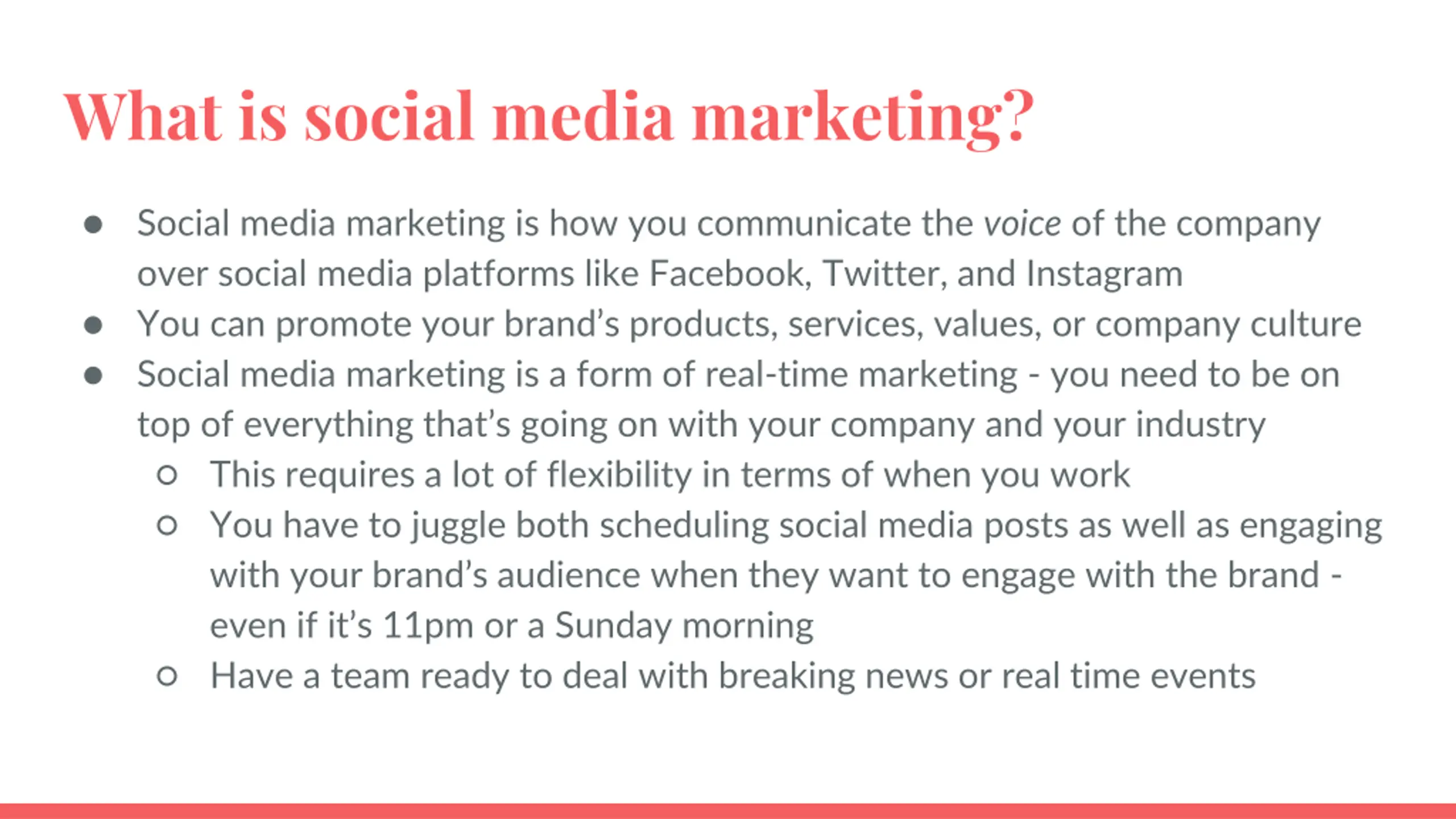 What is social media marketing? Social media marketing is how you communicate the voice of the company over social media platforms like Facebook, Twitter, and Instagram You can promote your brand s products, services, values, or company culture Social media marketing is a form of real-time marketing - you need to be on top of everything that s going on with your company and your industry This requires a lot of flexibility in terms of when you work You have to juggle both scheduling social media posts as well as engaging with your brand s audience when they want to engage with the brand - even if it s 11pm or a Sunday morning Have a team ready to deal with breaking news or real time events