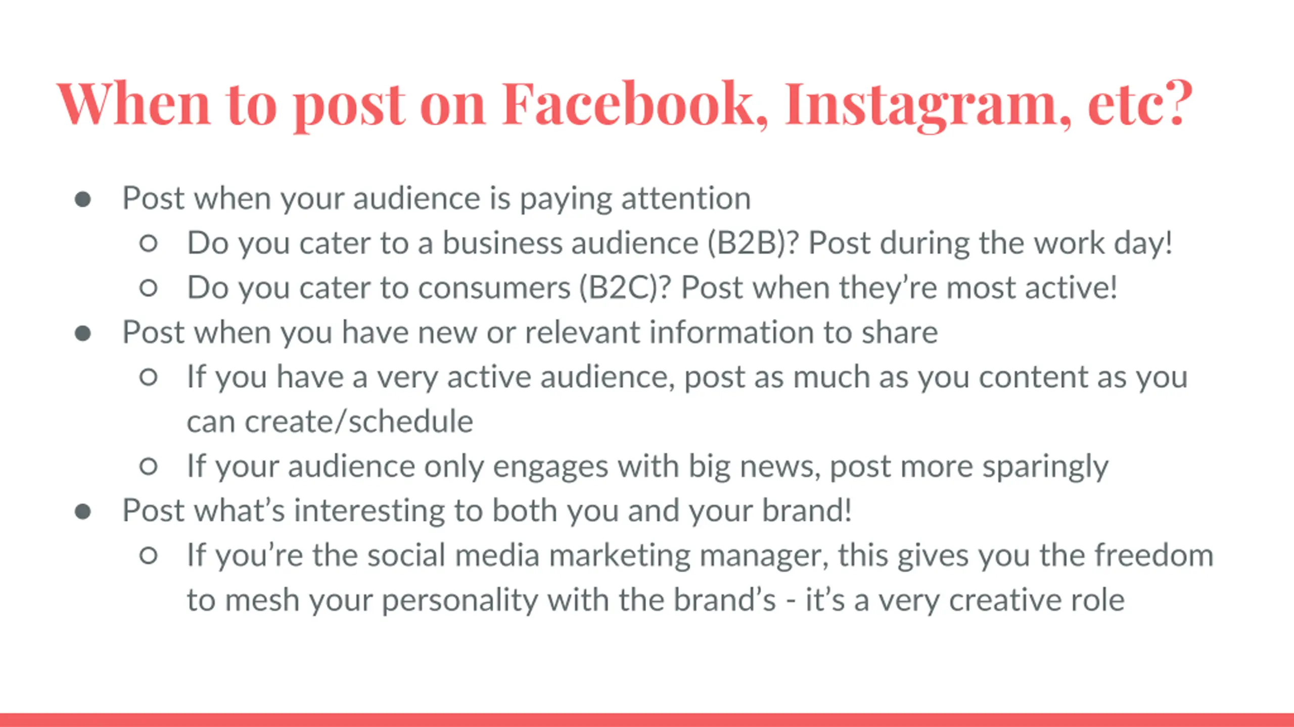 When to post on Facebook, Instagram, etc? Post when your audience is paying attention Do you cater to a business audience (B2B)? Post during the work day! Do you cater to consumers (B2C)? Post when they re most active! Post when you have new or relevant information to share If you have a very active audience, post as much as you content as you can create/schedule If your audience only engages with big news, post more sparingly Post what s interesting to both you and your brand! If you re the social media marketing manager, this gives you the freedom to mesh your personality with the brand s - it s a very creative role