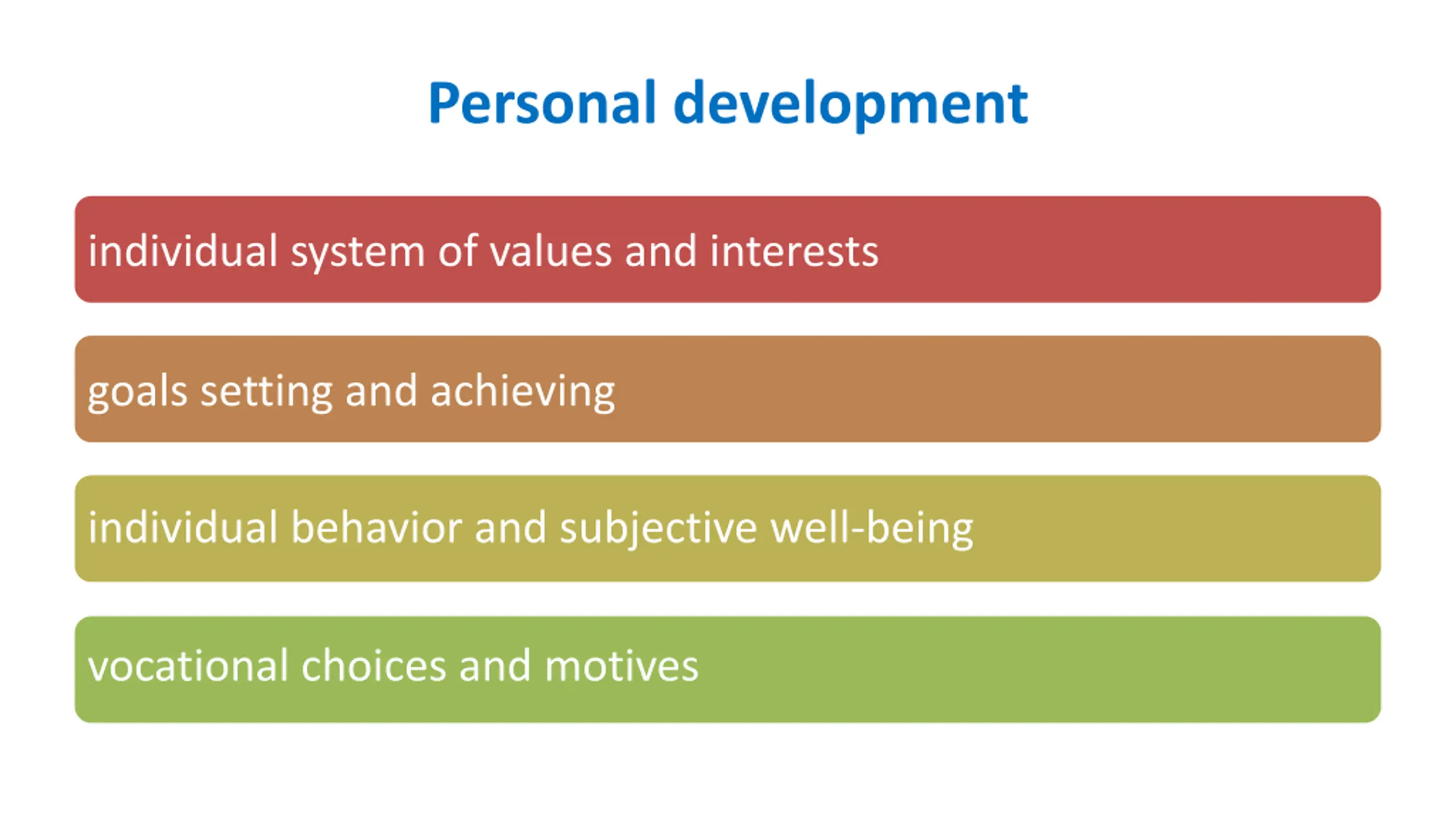 Personal development individual system of values and interests goals setting and achieving individual behavior and subjective well-being vocational choices and motives