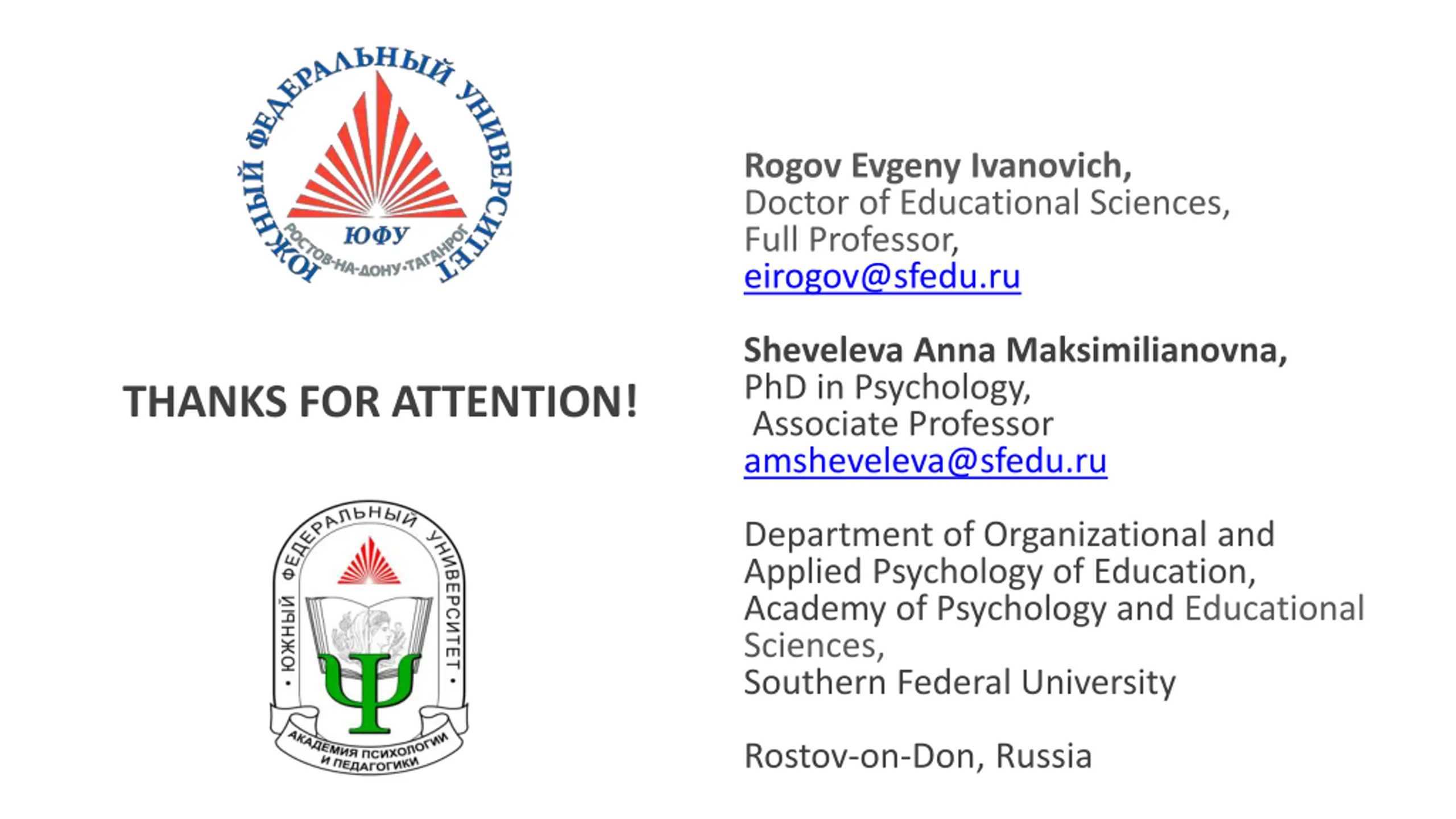 Rogov Evgeny Ivanovich, Doctor of Educational Sciences, Full Professor, eirogov@sfedu.ru Sheveleva Anna Maksimilianovna, PhD in Psychology, Associate Professor amsheveleva@sfedu.ru THANKS FOR ATTENTION! Department of Organizational and Applied Psychology of Education, Academy of Psychology and Educational Sciences, Southern Federal University Rostov-on-Don, Russia