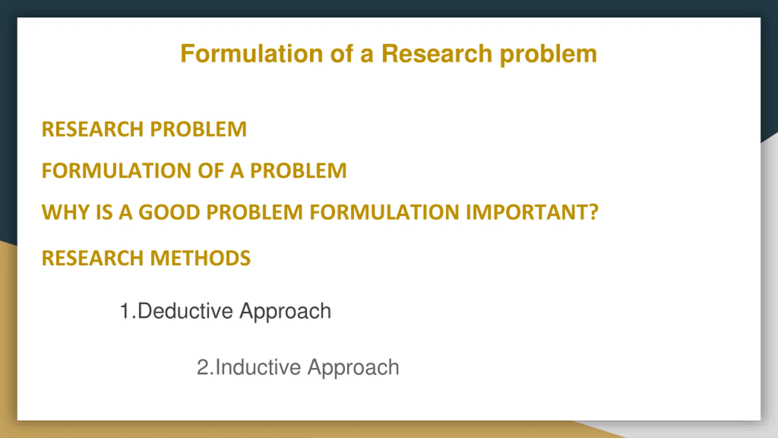 Formulation of a Research problem RESEARCH PROBLEM FORMULATION OF A PROBLEM WHY IS A GOOD PROBLEM FORMULATION IMPORTANT? RESEARCH METHODS 1.Deductive Approach 2.Inductive Approach