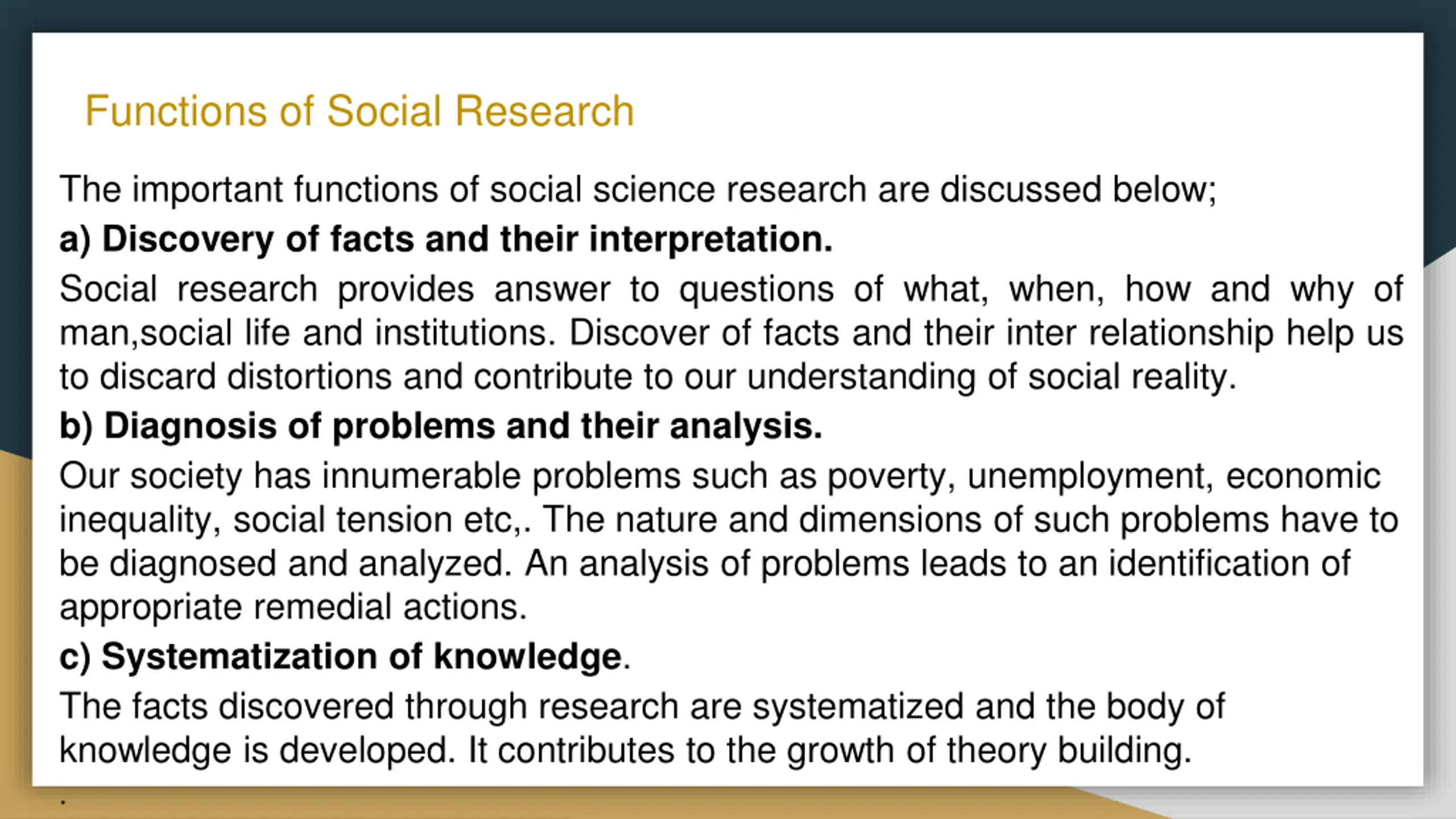 Functions of Social Research The important functions of social science research are discussed below; a) Discovery of facts and their interpretation. Social research provides answer to questions of what, when, how and why of man,social life and institutions. Discover of facts and their inter relationship help us to discard distortions and contribute to our understanding of social reality. b) Diagnosis of problems and their analysis. Our society has innumerable problems such as poverty, unemployment, economic inequality, social tension etc,. The nature and dimensions of such problems have to be diagnosed and analyzed. An analysis of problems leads to an identification of appropriate remedial actions. c) Systematization of knowledge. The facts discovered through research are systematized and the body of knowledge is developed. It contributes to the growth of theory building. .