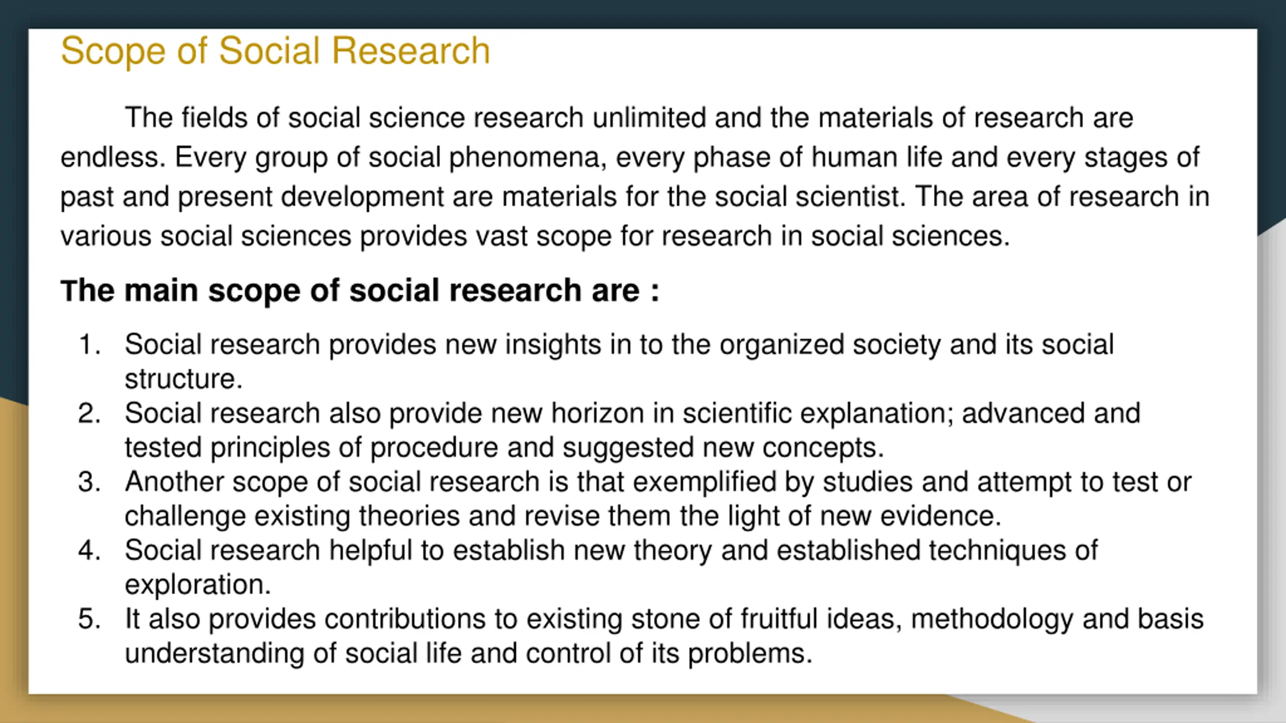 Scope of Social Research The fields of social science research unlimited and the materials of research are endless. Every group of social phenomena, every phase of human life and every stages of past and present development are materials for the social scientist. The area of research in various social sciences provides vast scope for research in social sciences. The main scope of social research are : 1. Social research provides new insights in to the organized society and its social structure. 2. Social research also provide new horizon in scientific explanation; advanced and tested principles of procedure and suggested new concepts. 3. Another scope of social research is that exemplified by studies and attempt to test or challenge existing theories and revise them the light of new evidence. 4. Social research helpful to establish new theory and established techniques of exploration. 5. It also provides contributions to existing stone of fruitful ideas, methodology and basis understanding of social life and control of its problems.