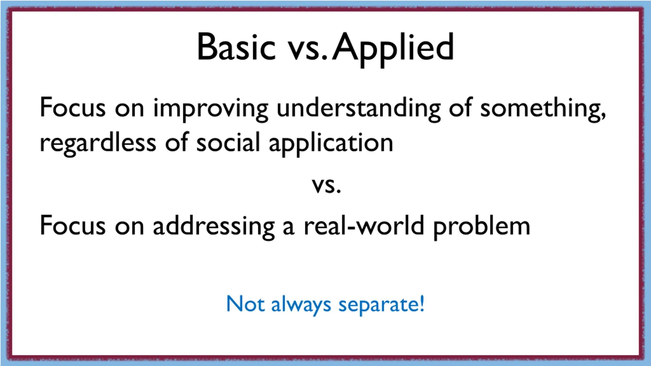Basic vs. Applied Focus on improving understanding of something, regardless of social application vs. Focus on addressing a real-world problem Not always separate!