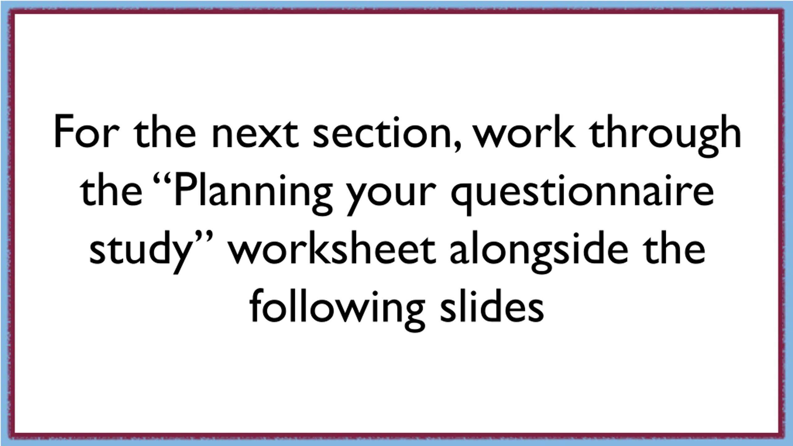 For the next section, work through the Planning your questionnaire study worksheet alongside the following slides