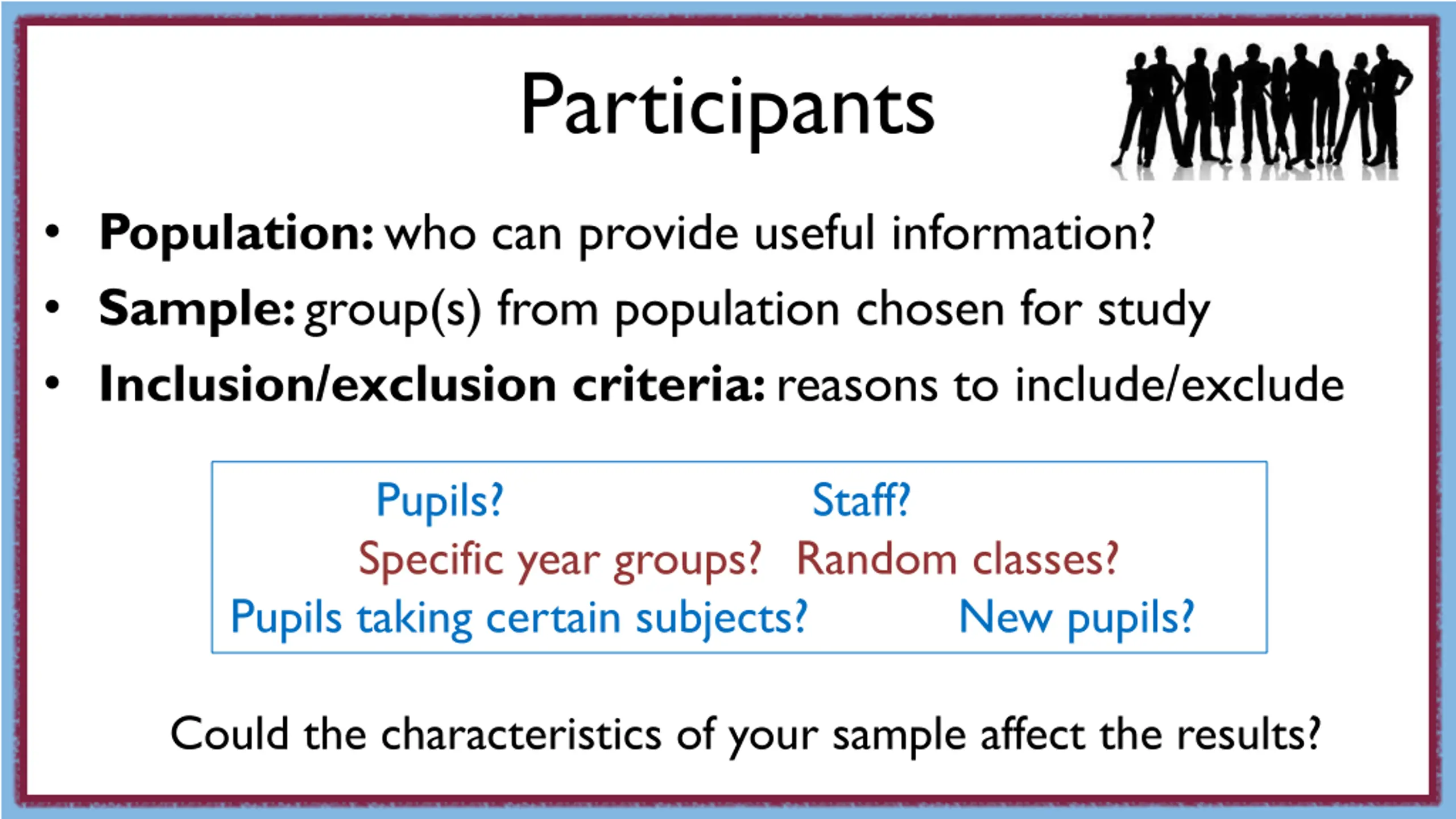 Participants Population: who can provide useful information? Sample: group(s) from population chosen for study Inclusion/exclusion criteria: reasons to include/exclude Pupils? Specific year groups? Random classes? Pupils taking certain subjects? Staff? New pupils? Could the characteristics of your sample affect the results?