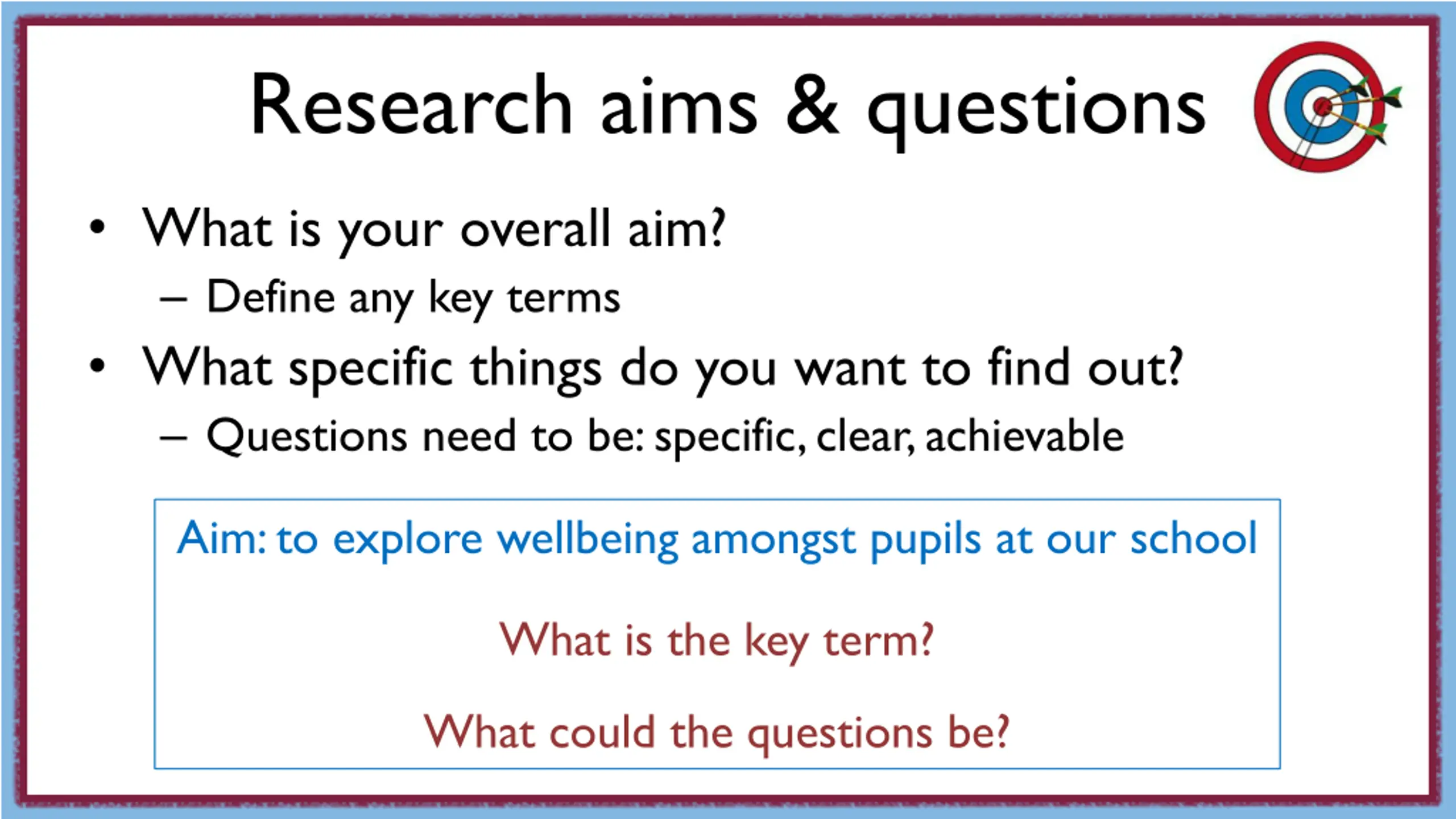 Research aims & questions What is your overall aim? Define any key terms What specific things do you want to find out? Questions need to be: specific, clear, achievable Aim: to explore wellbeing amongst pupils at our school What is the key term? What could the questions be?