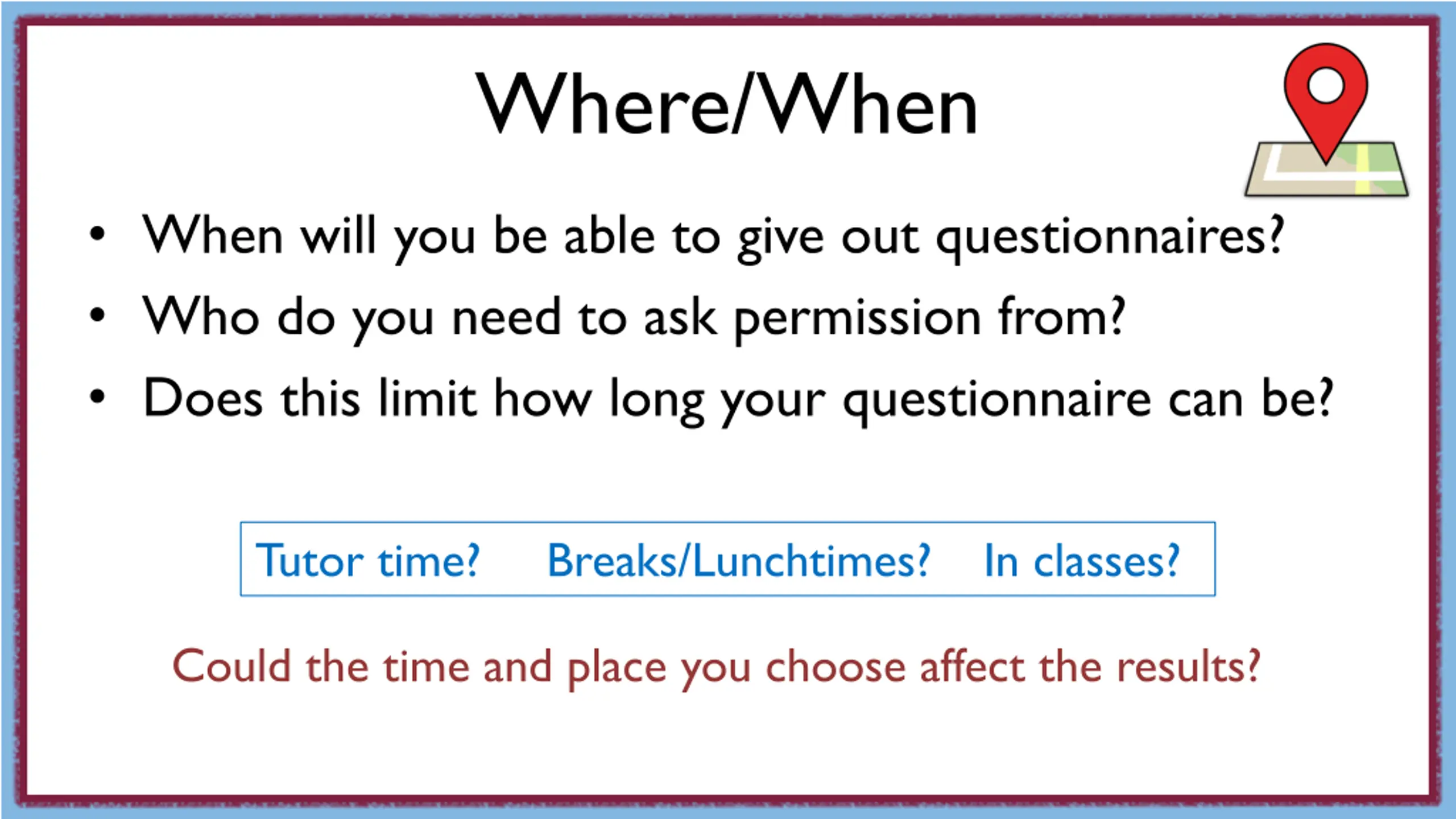 Where/When When will you be able to give out questionnaires? Who do you need to ask permission from? Does this limit how long your questionnaire can be? Tutor time? Breaks/Lunchtimes? In classes? Could the time and place you choose affect the results?
