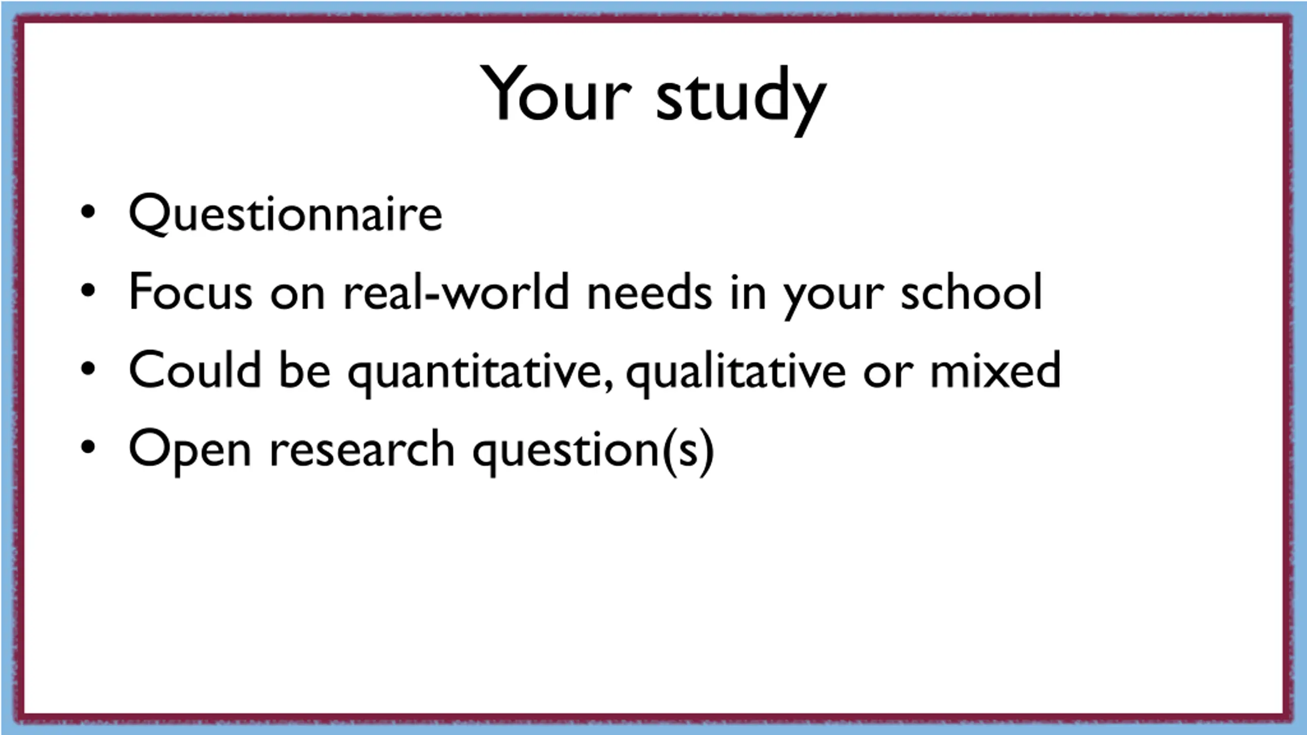 Your study Questionnaire Focus on real-world needs in your school Could be quantitative, qualitative or mixed Open research question(s)