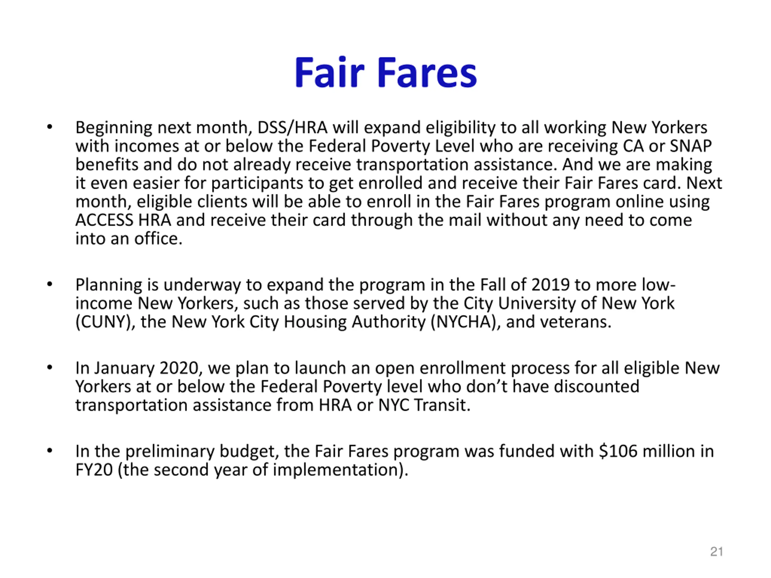 Fair Fares Beginning next month, DSS/HRA will expand eligibility to all working New Yorkers with incomes at or below the Federal Poverty Level who are receiving CA or SNAP benefits and do not already receive transportation assistance. And we are making it even easier for participants to get enrolled and receive their Fair Fares card. Next month, eligible clients will be able to enroll in the Fair Fares program online using ACCESS HRA and receive their card through the mail without any need to come into an office. Planning is underway to expand the program in the Fall of 2019 to more low- income New Yorkers, such as those served by the City University of New York (CUNY), the New York City Housing Authority (NYCHA), and veterans. In January 2020, we plan to launch an open enrollment process for all eligible New Yorkers at or below the Federal Poverty level who don t have discounted transportation assistance from HRA or NYC Transit. In the preliminary budget, the Fair Fares program was funded with $106 million in FY20 (the second year of implementation). 21