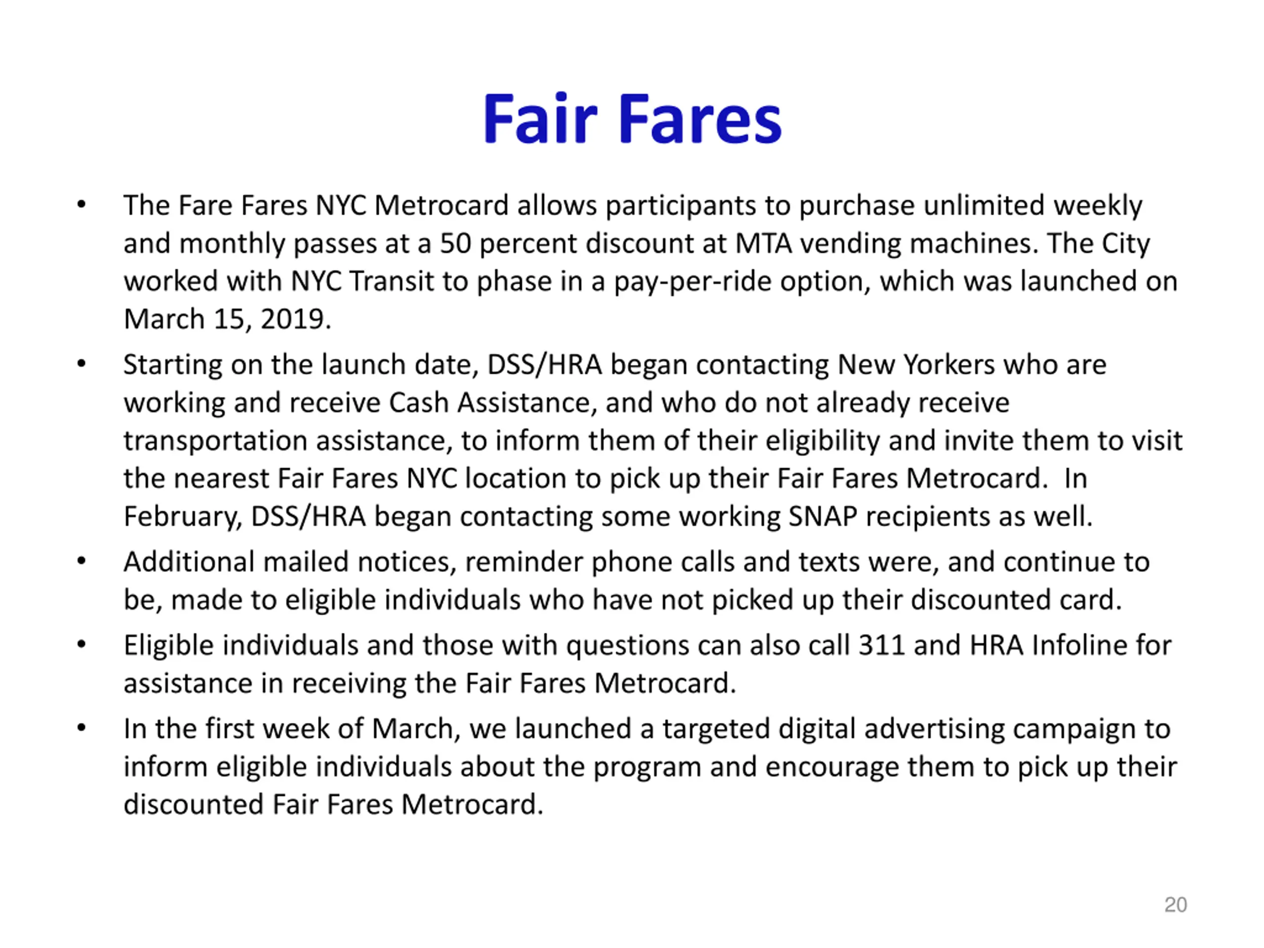 Fair Fares The Fare Fares NYC Metrocard allows participants to purchase unlimited weekly and monthly passes at a 50 percent discount at MTA vending machines. The City worked with NYC Transit to phase in a pay-per-ride option, which was launched on March 15, 2019. Starting on the launch date, DSS/HRA began contacting New Yorkers who are working and receive Cash Assistance, and who do not already receive transportation assistance, to inform them of their eligibility and invite them to visit the nearest Fair Fares NYC location to pick up their Fair Fares Metrocard. In February, DSS/HRA began contacting some working SNAP recipients as well. Additional mailed notices, reminder phone calls and texts were, and continue to be, made to eligible individuals who have not picked up their discounted card. Eligible individuals and those with questions can also call 311 and HRA Infoline for assistance in receiving the Fair Fares Metrocard. In the first week of March, we launched a targeted digital advertising campaign to inform eligible individuals about the program and encourage them to pick up their discounted Fair Fares Metrocard. 20