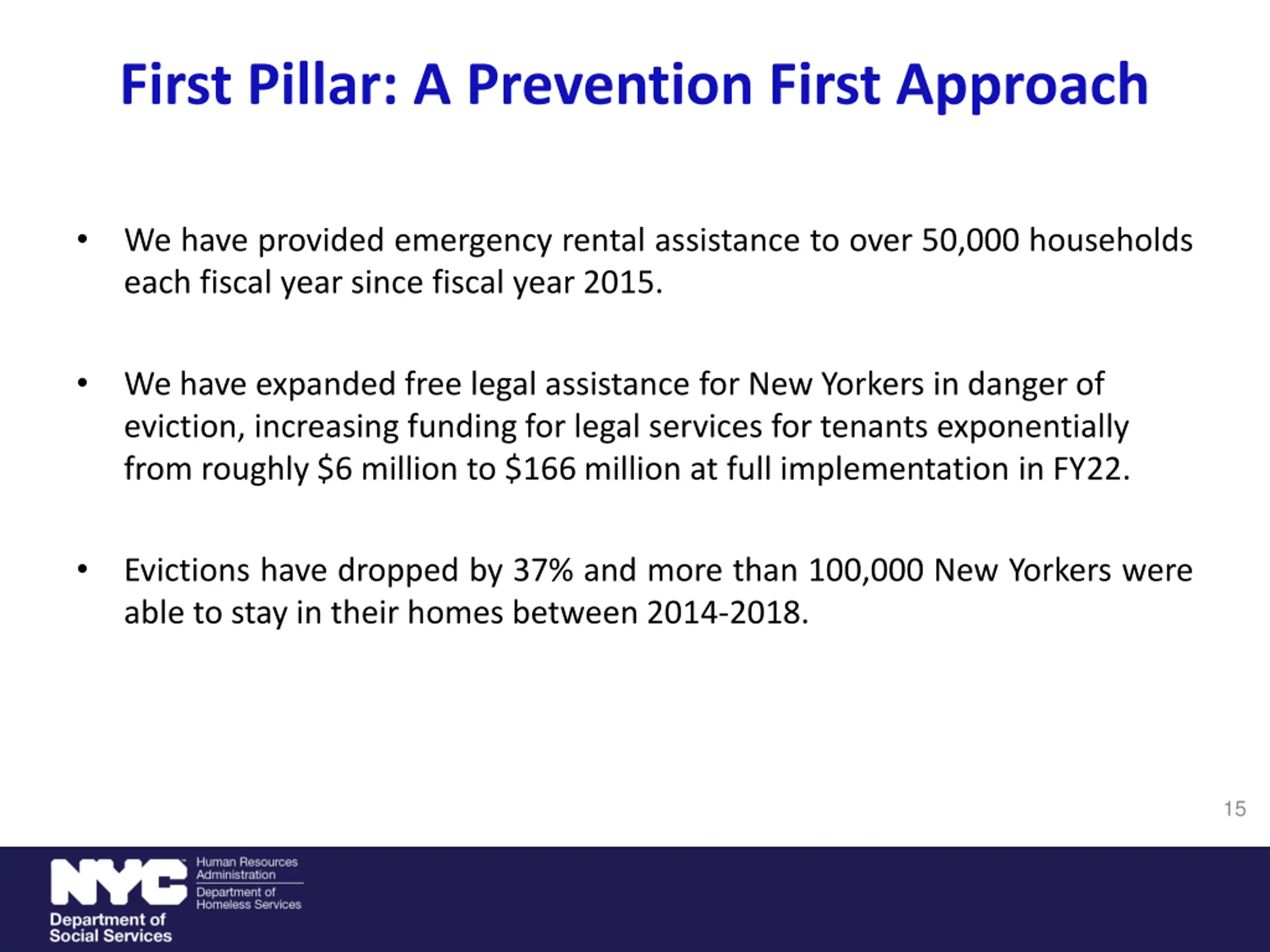 First Pillar: A Prevention First Approach We have provided emergency rental assistance to over 50,000 households each fiscal year since fiscal year 2015. We have expanded free legal assistance for New Yorkers in danger of eviction, increasing funding for legal services for tenants exponentially from roughly $6 million to $166 million at full implementation in FY22. Evictions have dropped by 37% and more than 100,000 New Yorkers were able to stay in their homes between 2014-2018. 15 15