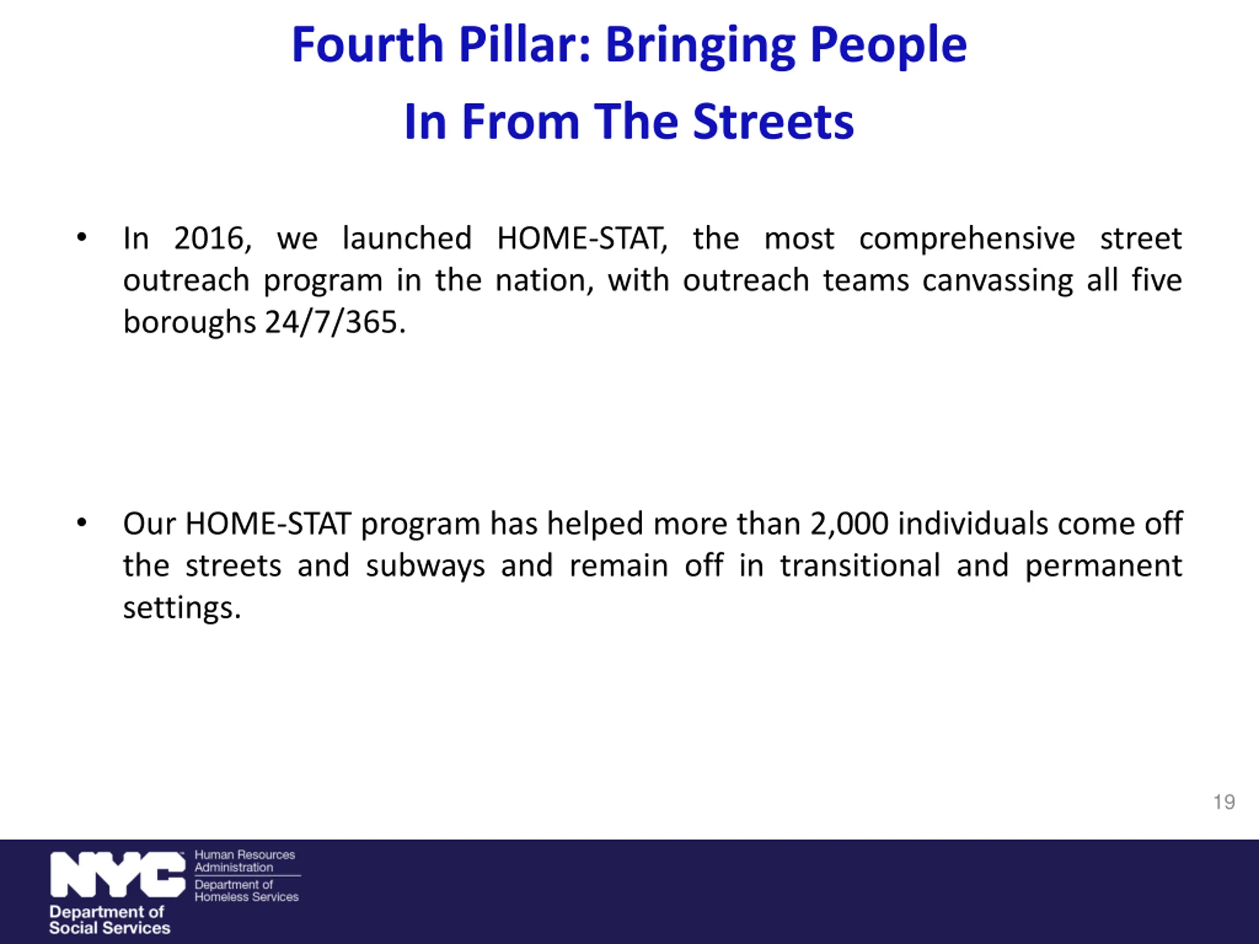 Fourth Pillar: Bringing People In From The Streets In 2016, we launched HOME-STAT, the most comprehensive street outreach program in the nation, with outreach teams canvassing all five boroughs 24/7/365. Our HOME-STAT program has helped more than 2,000 individuals come off the streets and subways and remain off in transitional and permanent settings. 19 19