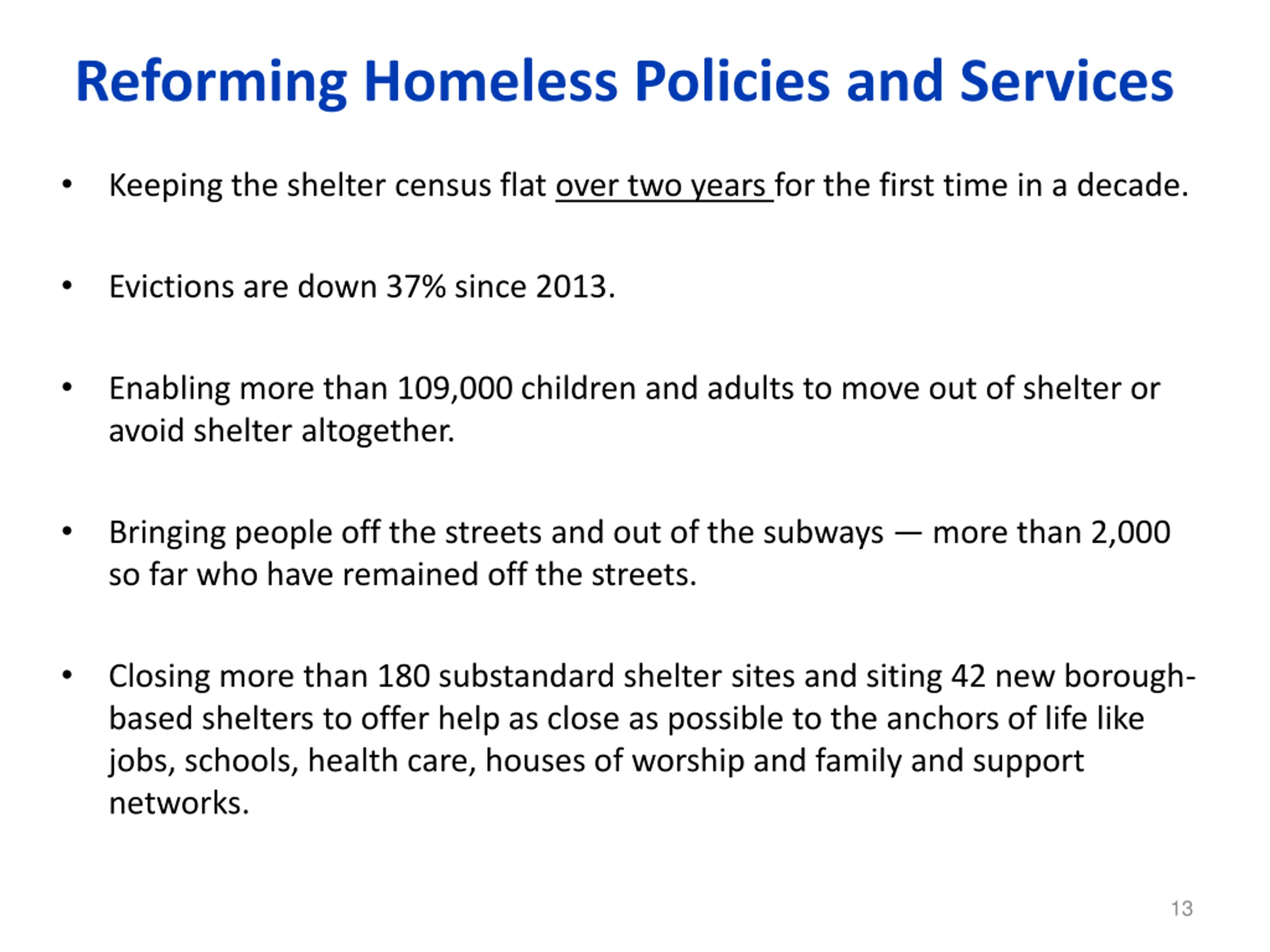 Reforming Homeless Policies and Services Keeping the shelter census flat over two years for the first time in a decade. Evictions are down 37% since 2013. Enabling more than 109,000 children and adults to move out of shelter or avoid shelter altogether. Bringing people off the streets and out of the subways more than 2,000 so far who have remained off the streets. Closing more than 180 substandard shelter sites and siting 42 new borough- based shelters to offer help as close as possible to the anchors of life like jobs, schools, health care, houses of worship and family and support networks. 13