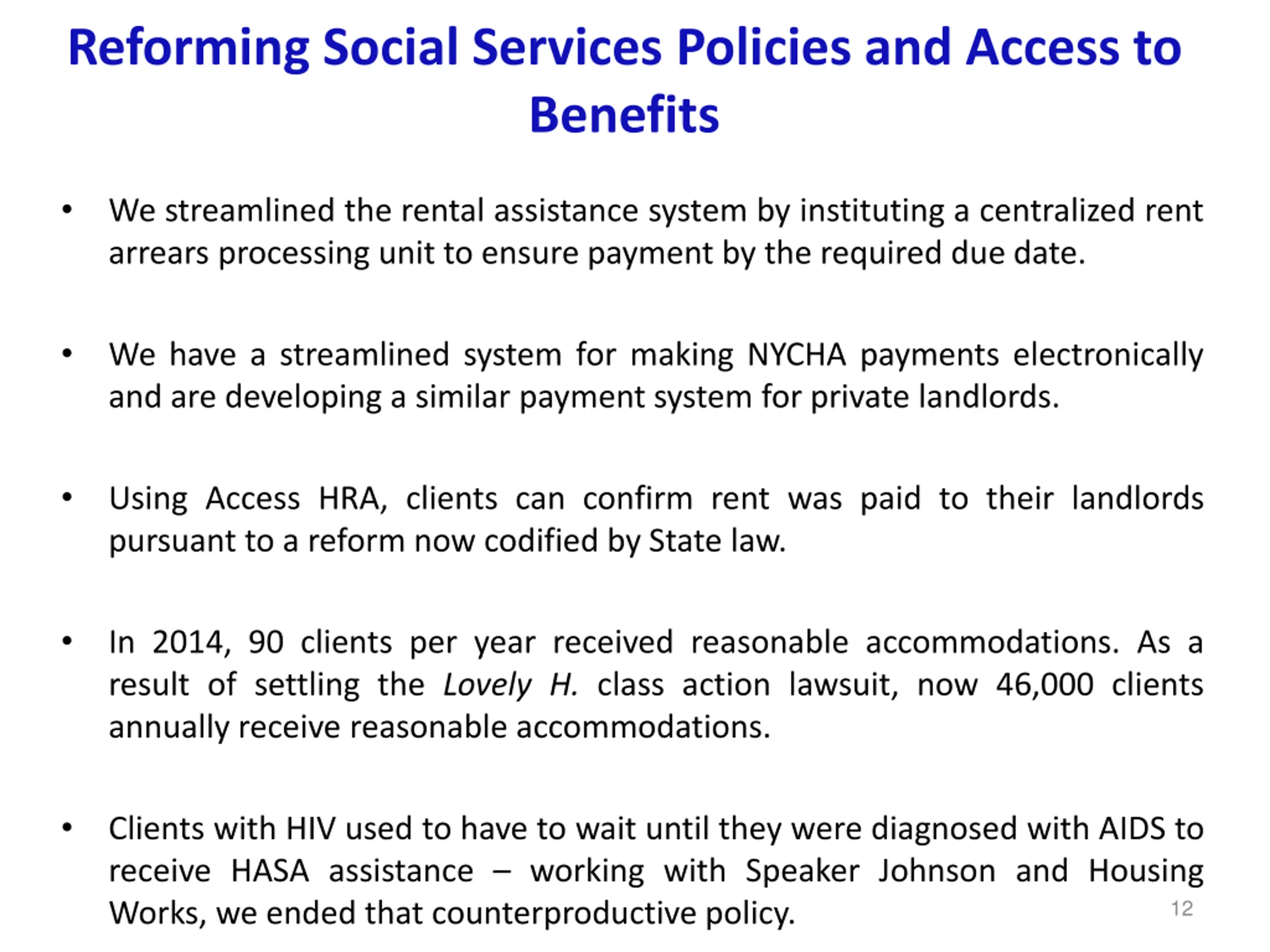 Reforming Social Services Policies and Access to Benefits We streamlined the rental assistance system by instituting a centralized rent arrears processing unit to ensure payment by the required due date. We have a streamlined system for making NYCHA payments electronically and are developing a similar payment system for private landlords. Using Access HRA, clients can confirm rent was paid to their landlords pursuant to a reform now codified by State law. In 2014, 90 clients per year received reasonable accommodations. As a result of settling the Lovely H. class action lawsuit, now 46,000 clients annually receive reasonable accommodations. Clients with HIV used to have to wait until they were diagnosed with AIDS to receive HASA assistance working with Speaker Johnson and Housing Works, we ended that counterproductive policy. 12