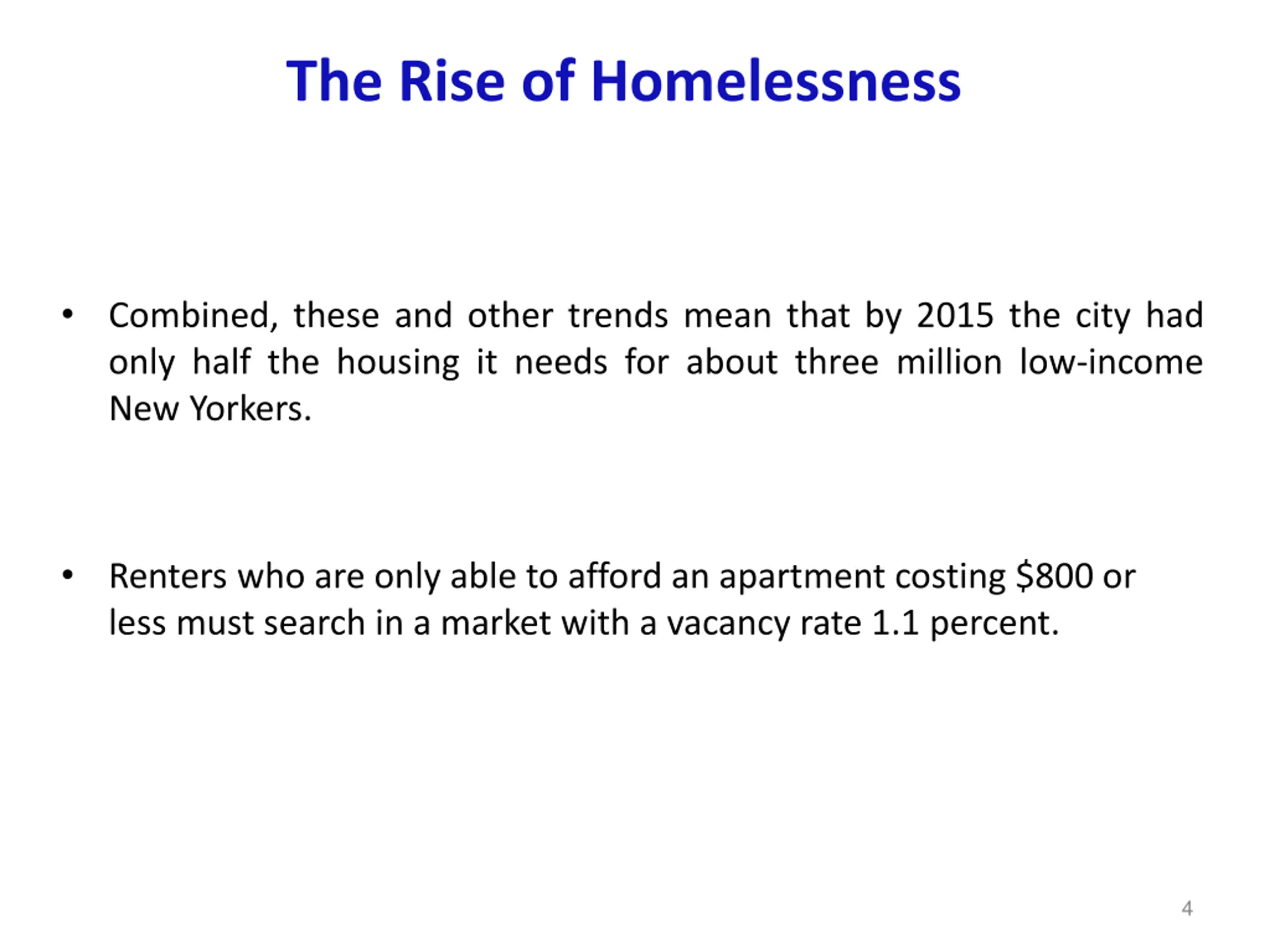 The Rise of Homelessness Combined, these and other trends mean that by 2015 the city had only half the housing it needs for about three million low-income New Yorkers. Renters who are only able to afford an apartment costing $800 or less must search in a market with a vacancy rate 1.1 percent. 4