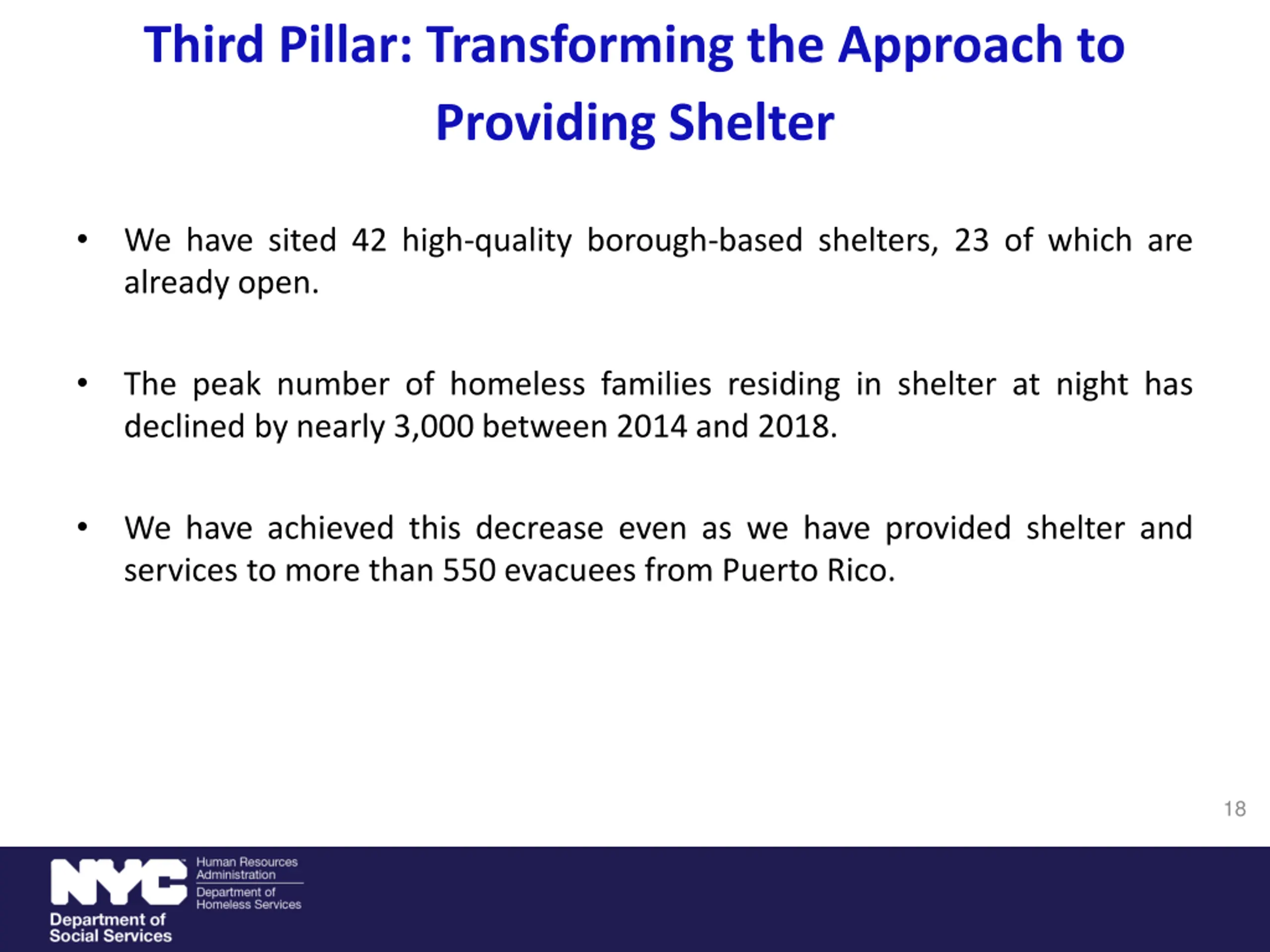 Third Pillar: Transforming the Approach to Providing Shelter We have sited 42 high-quality borough-based shelters, 23 of which are already open. The peak number of homeless families residing in shelter at night has declined by nearly 3,000 between 2014 and 2018. We have achieved this decrease even as we have provided shelter and services to more than 550 evacuees from Puerto Rico. 18 18
