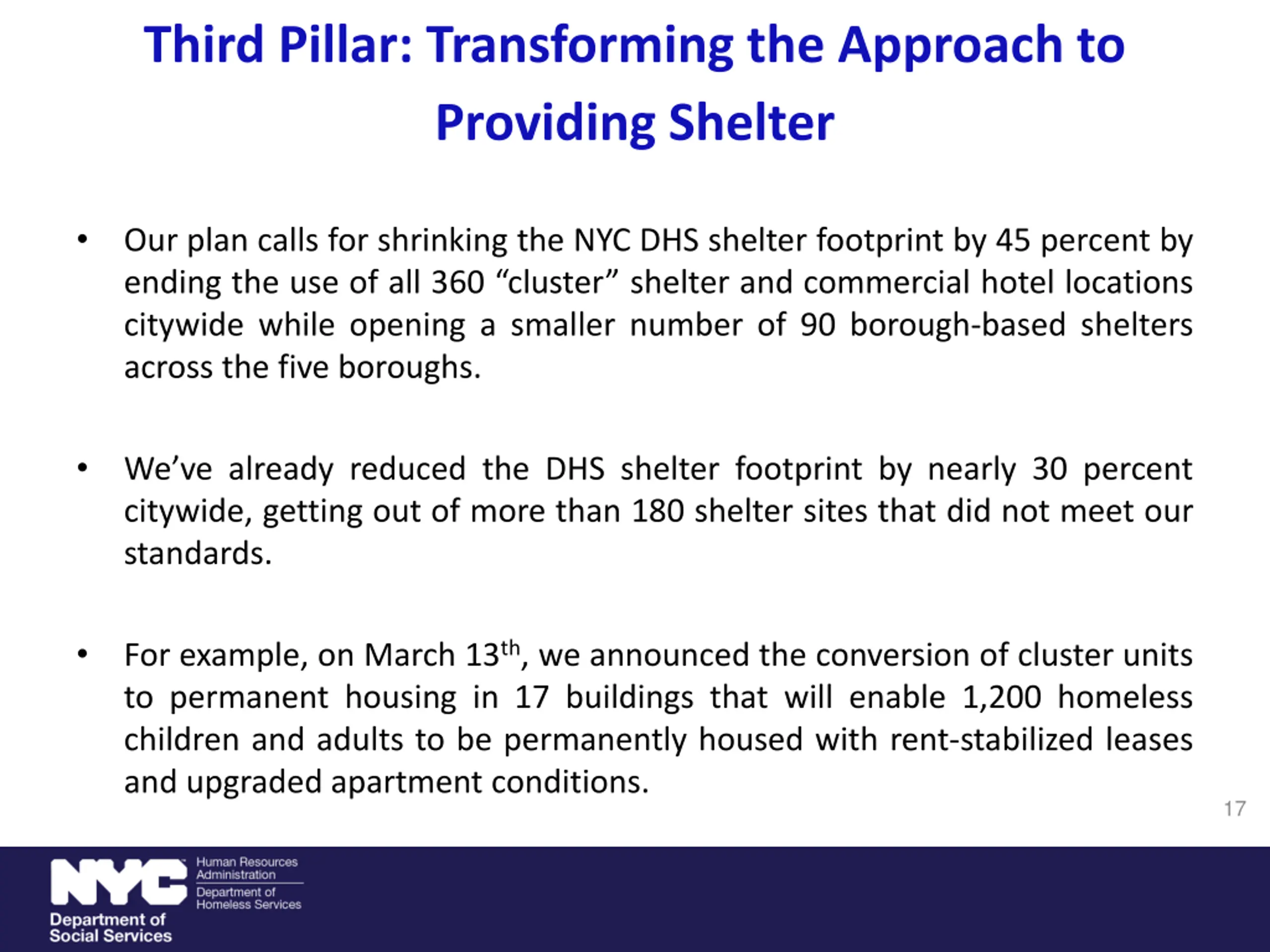 Third Pillar: Transforming the Approach to Providing Shelter Our plan calls for shrinking the NYC DHS shelter footprint by 45 percent by ending the use of all 360 cluster shelter and commercial hotel locations citywide while opening a smaller number of 90 borough-based shelters across the five boroughs. We ve already reduced the DHS shelter footprint by nearly 30 percent citywide, getting out of more than 180 shelter sites that did not meet our standards. For example, on March 13th, we announced the conversion of cluster units to permanent housing in 17 buildings that will enable 1,200 homeless children and adults to be permanently housed with rent-stabilized leases and upgraded apartment conditions. 17 17