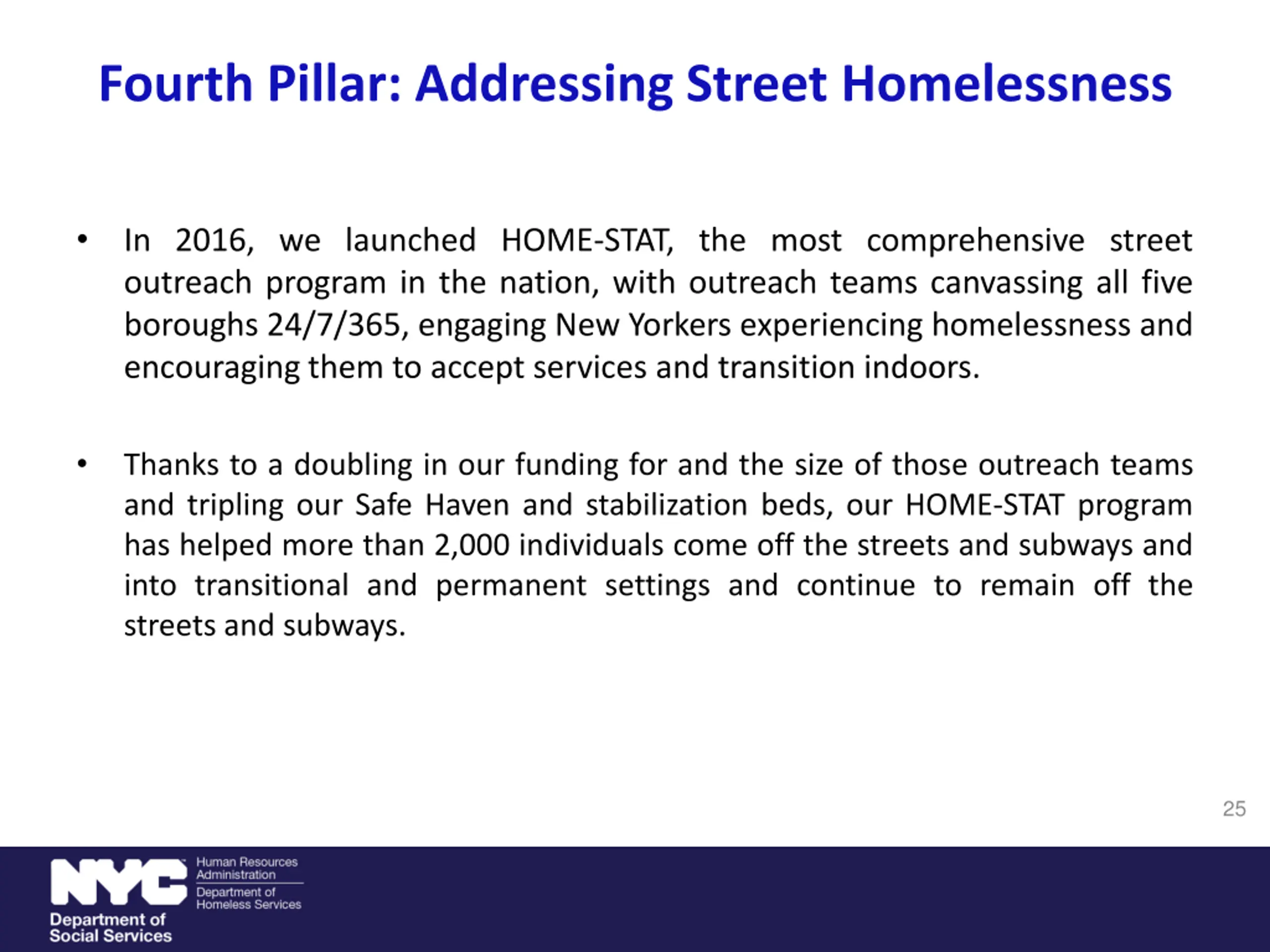 Fourth Pillar: Addressing Street Homelessness In 2016, we launched HOME-STAT, the most comprehensive street outreach program in the nation, with outreach teams canvassing all five boroughs 24/7/365, engaging New Yorkers experiencing homelessness and encouraging them to accept services and transition indoors. Thanks to a doubling in our funding for and the size of those outreach teams and tripling our Safe Haven and stabilization beds, our HOME-STAT program has helped more than 2,000 individuals come off the streets and subways and into transitional and permanent settings and continue to remain off the streets and subways. 25 25
