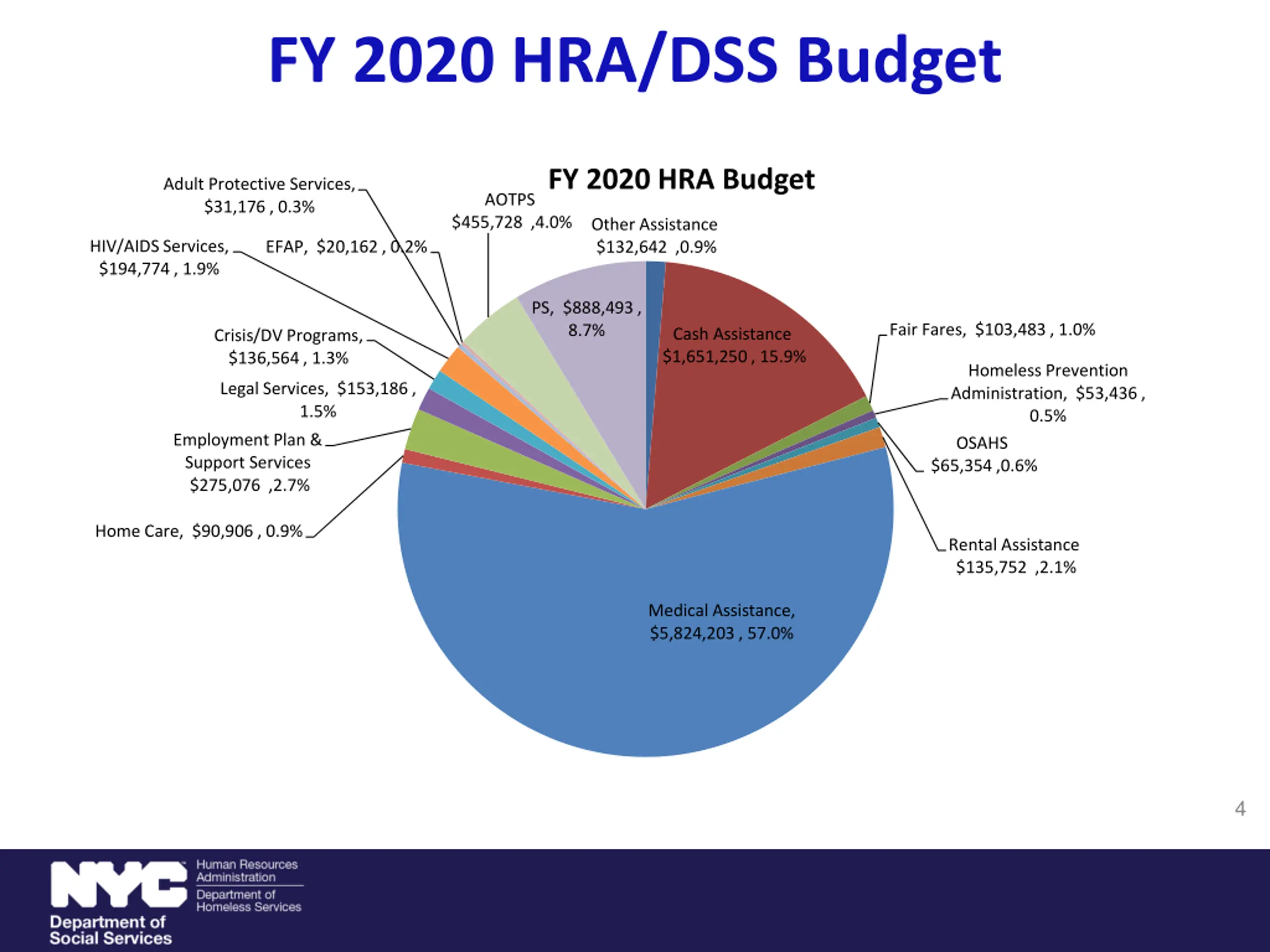 FY 2020 HRA/DSS Budget FY 2020 HRA Budget Adult Protective Services, $31,176 , 0.3% AOTPS $455,728 ,4.0% Other Assistance $132,642 ,0.9% HIV/AIDS Services, $194,774 , 1.9% EFAP, $20,162 , 0.2% PS, $888,493 , 8.7% Fair Fares, $103,483 , 1.0% Cash Assistance $1,651,250 , 15.9% Crisis/DV Programs, $136,564 , 1.3% Homeless Prevention Administration, $53,436 , 0.5% OSAHS $65,354 ,0.6% Legal Services, $153,186 , 1.5% Employment Plan & Support Services $275,076 ,2.7% Home Care, $90,906 , 0.9% Rental Assistance $135,752 ,2.1% Medical Assistance, $5,824,203 , 57.0% 4