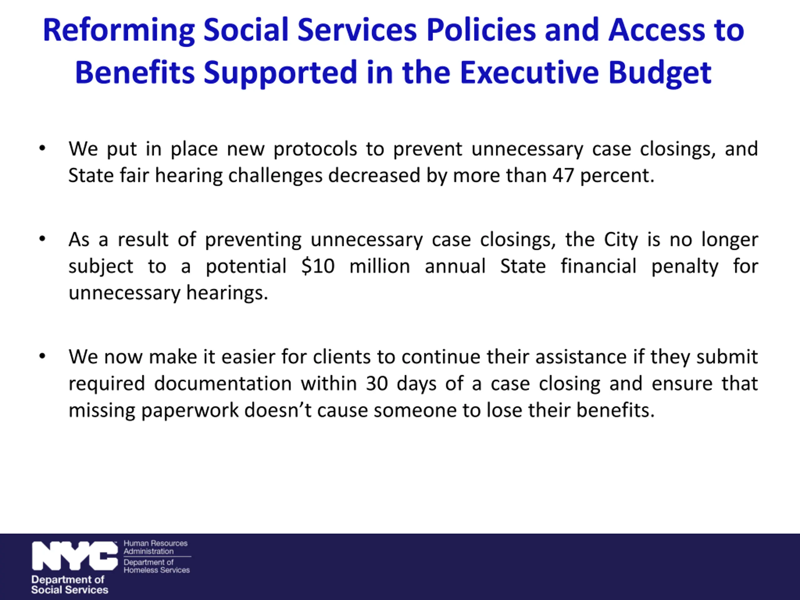 Reforming Social Services Policies and Access to Benefits Supported in the Executive Budget We put in place new protocols to prevent unnecessary case closings, and State fair hearing challenges decreased by more than 47 percent. As a result of preventing unnecessary case closings, the City is no longer subject to a potential $10 million annual State financial penalty for unnecessary hearings. We now make it easier for clients to continue their assistance if they submit required documentation within 30 days of a case closing and ensure that missing paperwork doesn t cause someone to lose their benefits. 13