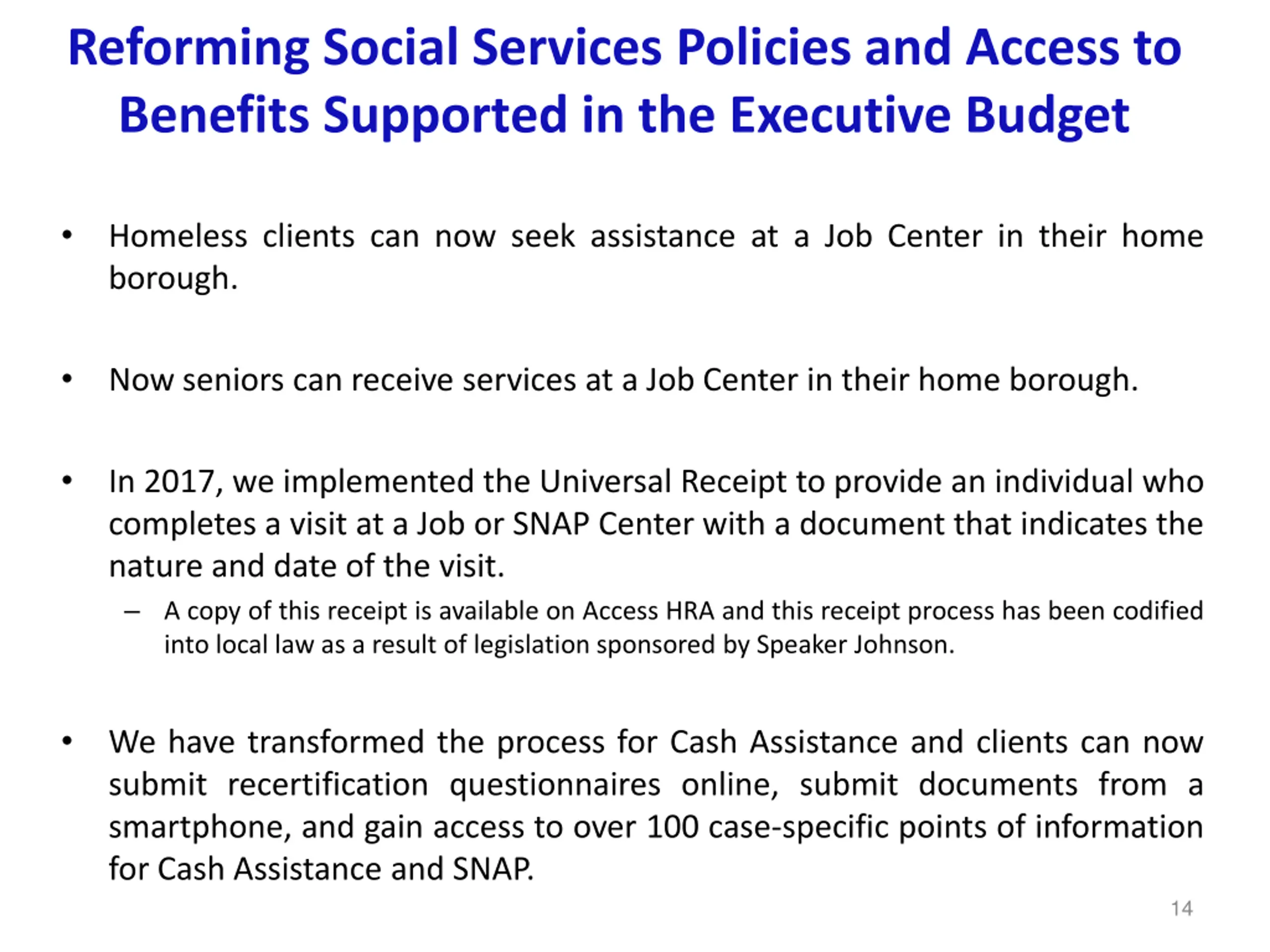 Reforming Social Services Policies and Access to Benefits Supported in the Executive Budget Homeless clients can now seek assistance at a Job Center in their home borough. Now seniors can receive services at a Job Center in their home borough. In 2017, we implemented the Universal Receipt to provide an individual who completes a visit at a Job or SNAP Center with a document that indicates the nature and date of the visit. A copy of this receipt is available on Access HRA and this receipt process has been codified into local law as a result of legislation sponsored by Speaker Johnson. We have transformed the process for Cash Assistance and clients can now submit recertification questionnaires online, submit documents from a smartphone, and gain access to over 100 case-specific points of information for Cash Assistance and SNAP. 14