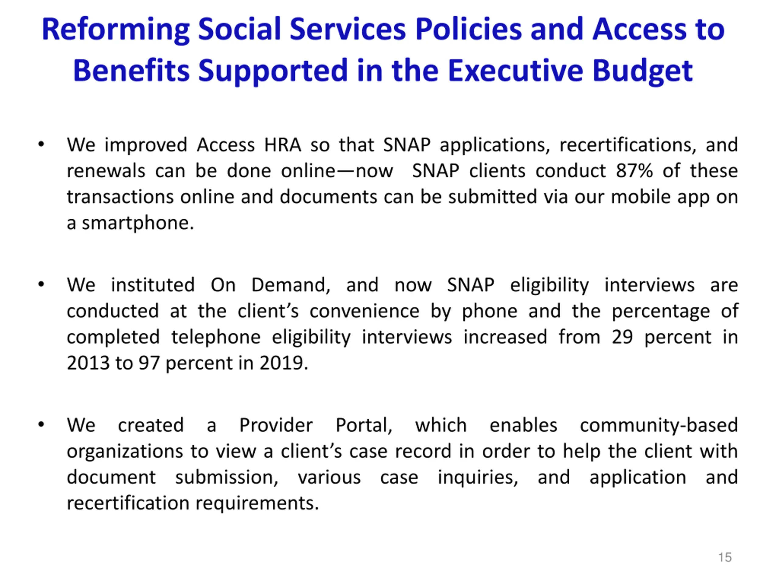 Reforming Social Services Policies and Access to Benefits Supported in the Executive Budget We improved Access HRA so that SNAP applications, recertifications, and renewals can be done online now SNAP clients conduct 87% of these transactions online and documents can be submitted via our mobile app on a smartphone. We instituted On Demand, and now SNAP eligibility interviews are conducted at the client s convenience by phone and the percentage of completed telephone eligibility interviews increased from 29 percent in 2013 to 97 percent in 2019. We created a Provider Portal, which enables community-based organizations to view a client s case record in order to help the client with document submission, various case inquiries, and application and recertification requirements. 15
