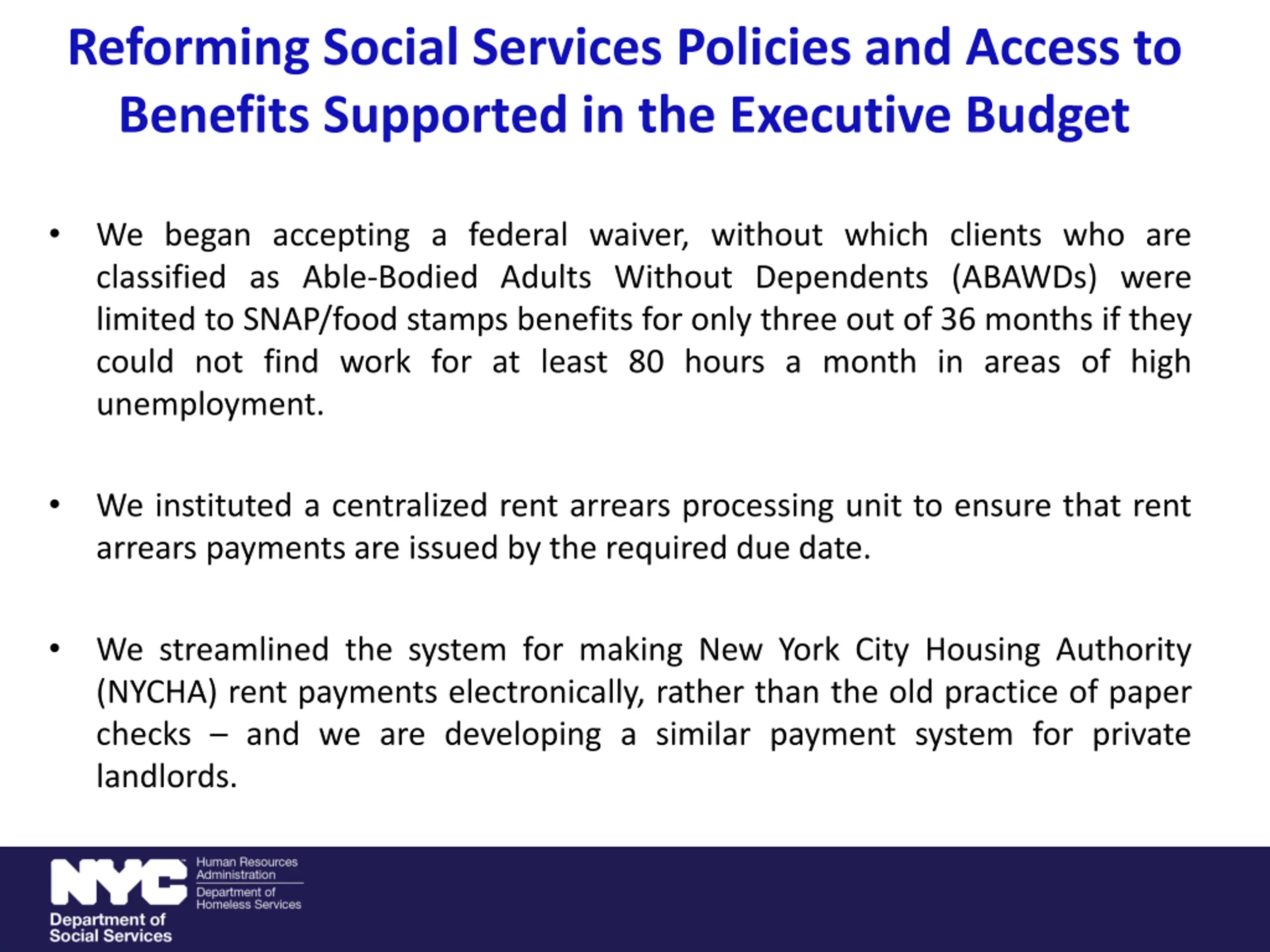 Reforming Social Services Policies and Access to Benefits Supported in the Executive Budget We began accepting a federal waiver, without which clients who are classified as Able-Bodied Adults Without Dependents (ABAWDs) were limited to SNAP/food stamps benefits for only three out of 36 months if they could not find work for at least 80 hours a month in areas of high unemployment. We instituted a centralized rent arrears processing unit to ensure that rent arrears payments are issued by the required due date. We streamlined the system for making New York City Housing Authority (NYCHA) rent payments electronically, rather than the old practice of paper checks and we are developing a similar payment system for private landlords. 16