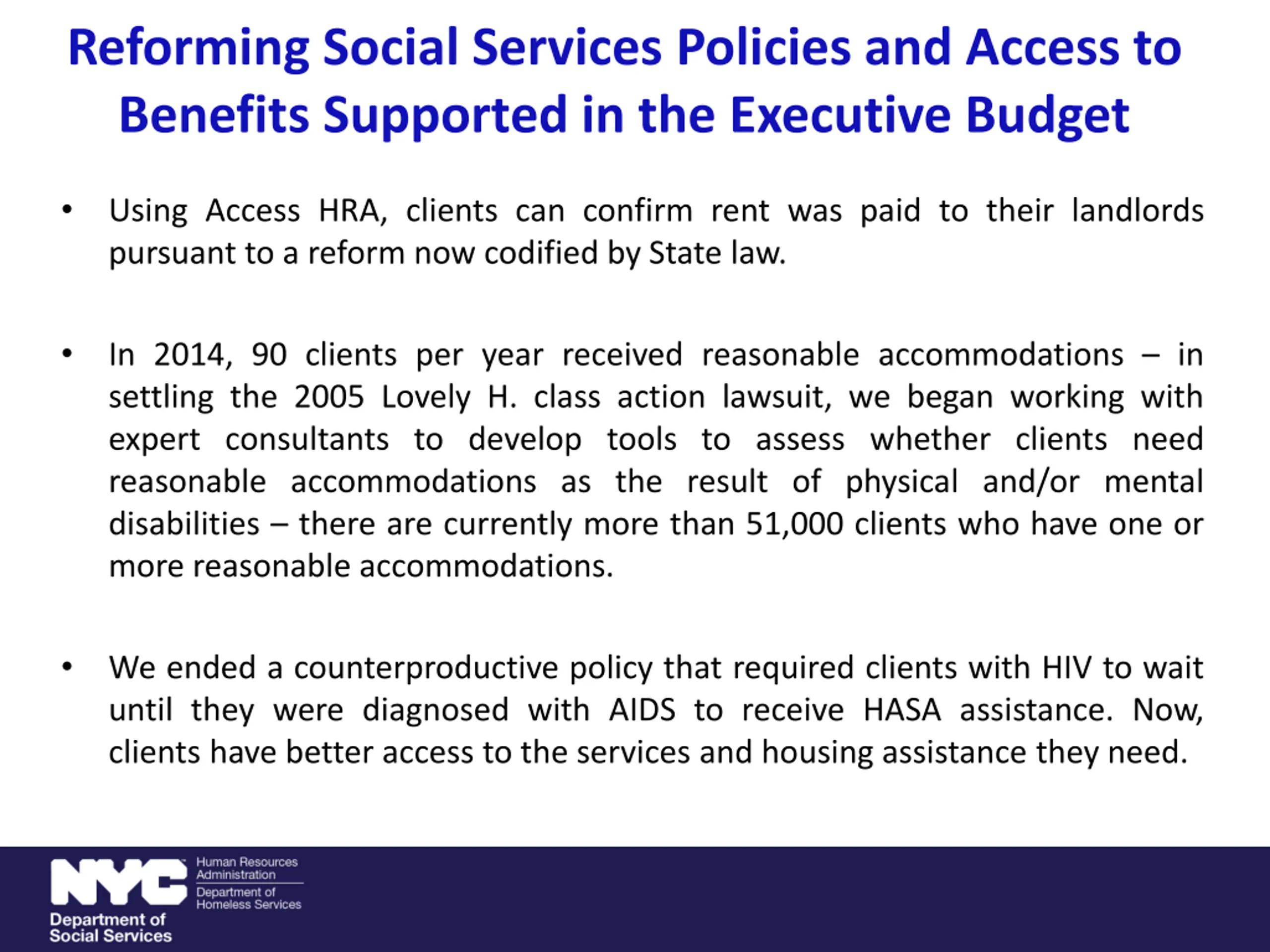 Reforming Social Services Policies and Access to Benefits Supported in the Executive Budget Using Access HRA, clients can confirm rent was paid to their landlords pursuant to a reform now codified by State law. In 2014, 90 clients per year received reasonable accommodations in settling the 2005 Lovely H. class action lawsuit, we began working with expert consultants to develop tools to assess whether clients need reasonable accommodations as the result of physical and/or mental disabilities there are currently more than 51,000 clients who have one or more reasonable accommodations. We ended a counterproductive policy that required clients with HIV to wait until they were diagnosed with AIDS to receive HASA assistance. Now, clients have better access to the services and housing assistance they need. 17