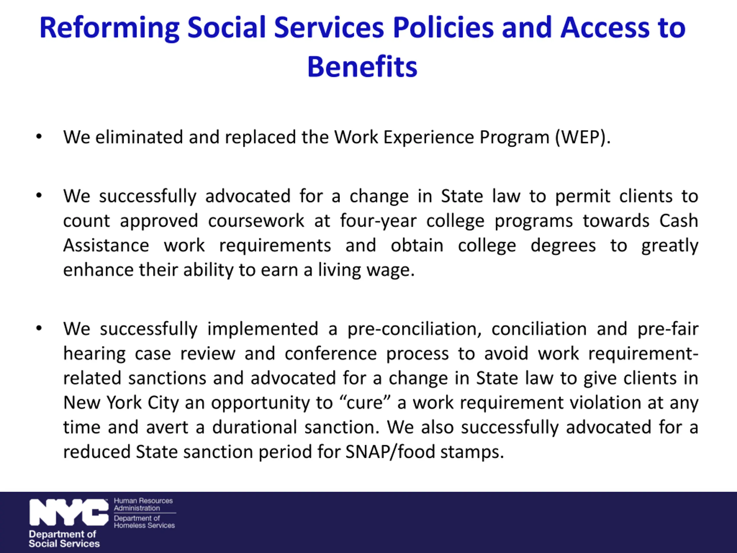 Reforming Social Services Policies and Access to Benefits We eliminated and replaced the Work Experience Program (WEP). We successfully advocated for a change in State law to permit clients to count approved coursework at four-year college programs towards Cash Assistance work requirements and obtain college degrees to greatly enhance their ability to earn a living wage. We successfully implemented a pre-conciliation, conciliation and pre-fair hearing case review and conference process to avoid work requirement- related sanctions and advocated for a change in State law to give clients in New York City an opportunity to cure a work requirement violation at any time and avert a durational sanction. We also successfully advocated for a reduced State sanction period for SNAP/food stamps. 12