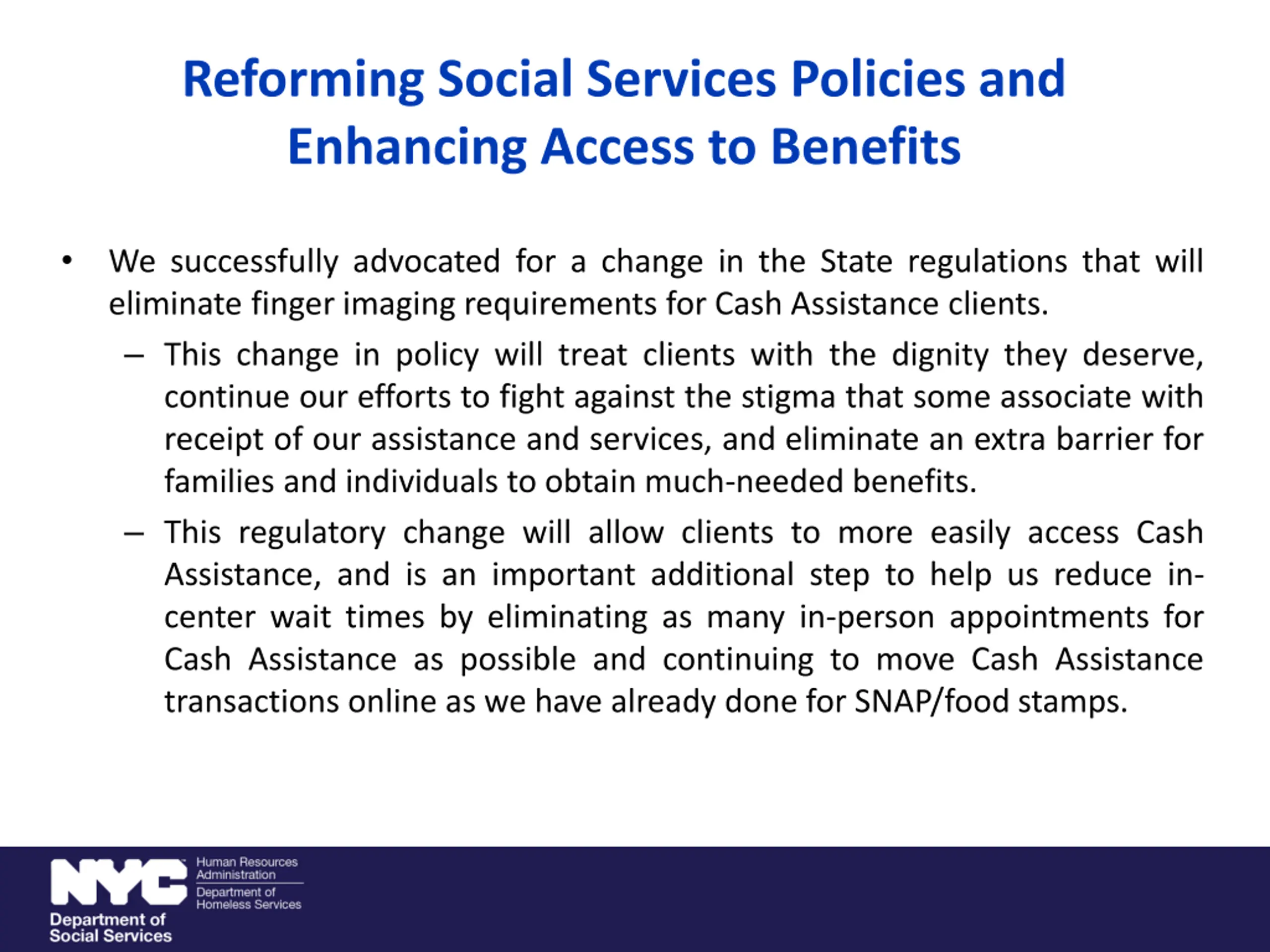 Reforming Social Services Policies and Enhancing Access to Benefits We successfully advocated for a change in the State regulations that will eliminate finger imaging requirements for Cash Assistance clients. This change in policy will treat clients with the dignity they deserve, continue our efforts to fight against the stigma that some associate with receipt of our assistance and services, and eliminate an extra barrier for families and individuals to obtain much-needed benefits. This regulatory change will allow clients to more easily access Cash Assistance, and is an important additional step to help us reduce in- center wait times by eliminating as many in-person appointments for Cash Assistance as possible and continuing to move Cash Assistance transactions online as we have already done for SNAP/food stamps. 11