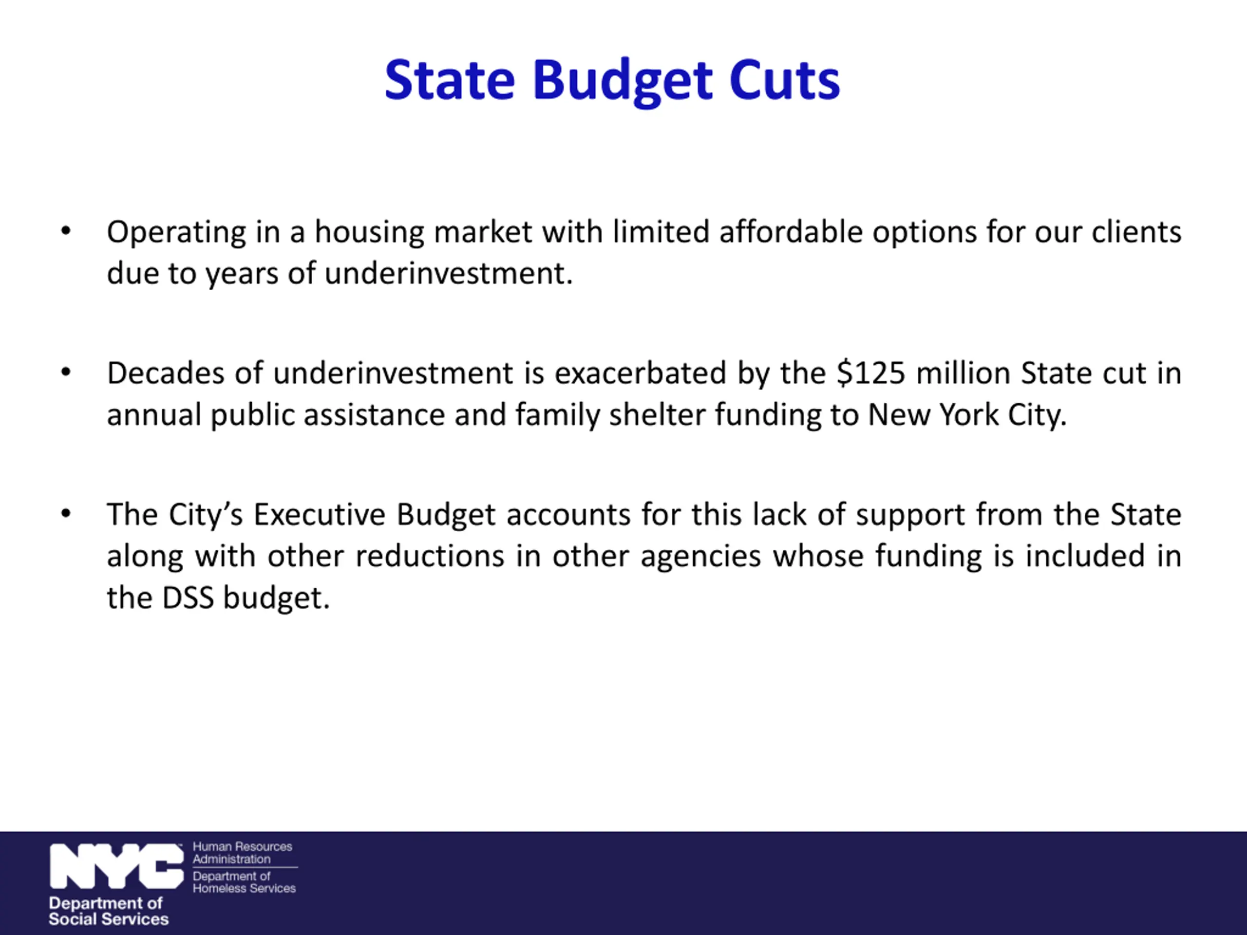 State Budget Cuts Operating in a housing market with limited affordable options for our clients due to years of underinvestment. Decades of underinvestment is exacerbated by the $125 million State cut in annual public assistance and family shelter funding to New York City. The City s Executive Budget accounts for this lack of support from the State along with other reductions in other agencies whose funding is included in the DSS budget. 3