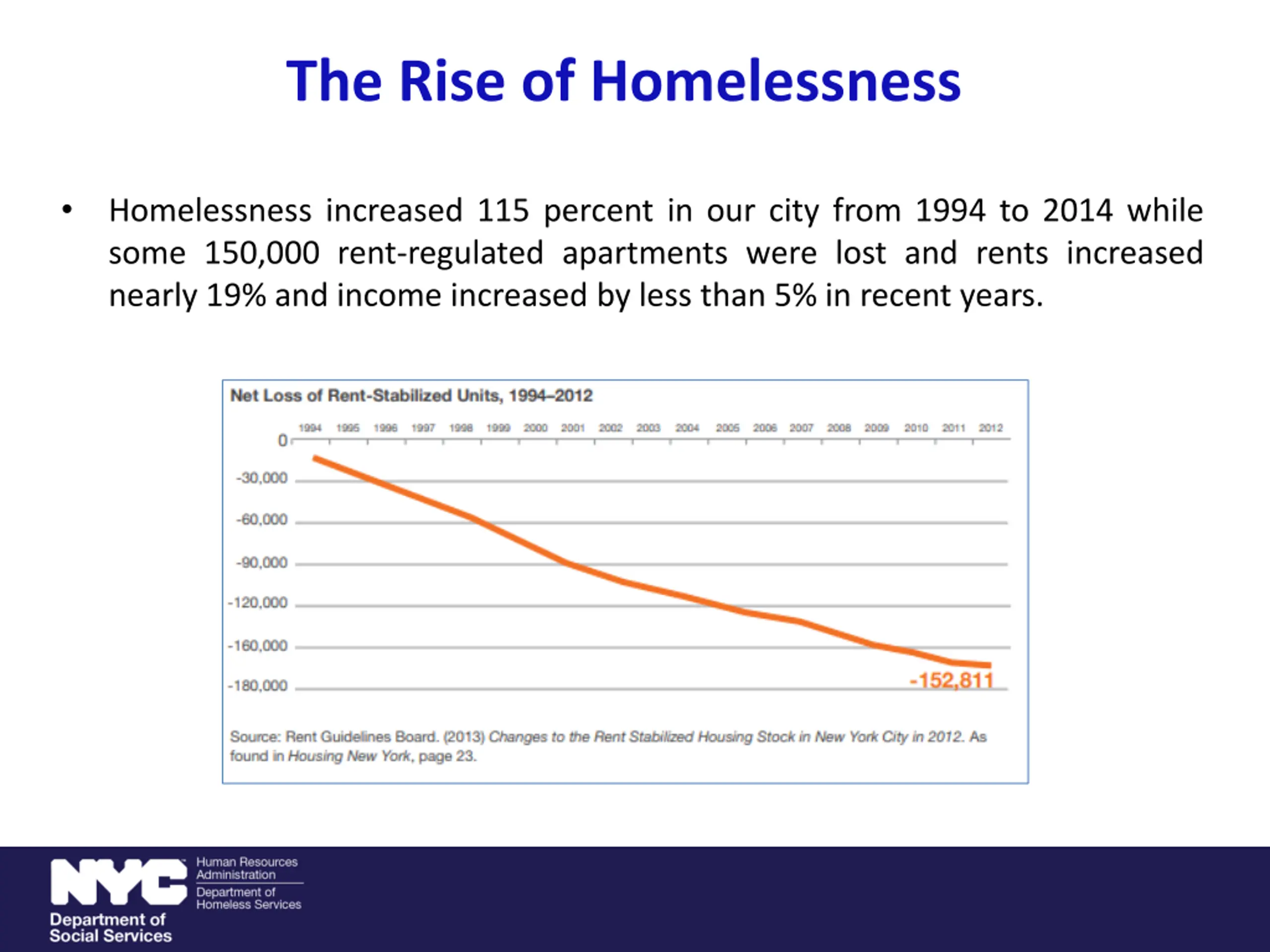 The Rise of Homelessness Homelessness increased 115 percent in our city from 1994 to 2014 while some 150,000 rent-regulated apartments were lost and rents increased nearly 19% and income increased by less than 5% in recent years. 18