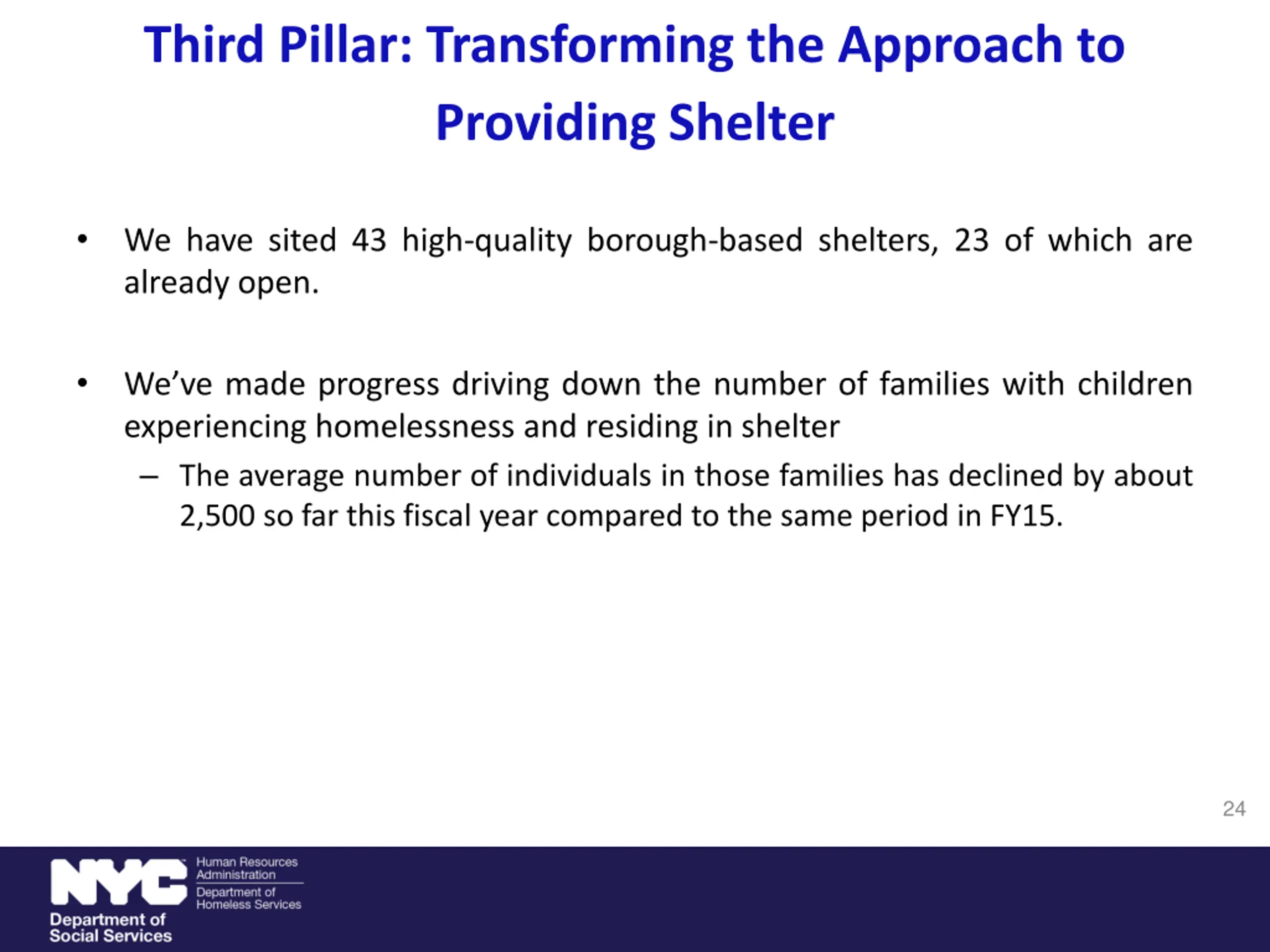 Third Pillar: Transforming the Approach to Providing Shelter We have sited 43 high-quality borough-based shelters, 23 of which are already open. We ve made progress driving down the number of families with children experiencing homelessness and residing in shelter The average number of individuals in those families has declined by about 2,500 so far this fiscal year compared to the same period in FY15. 24 24