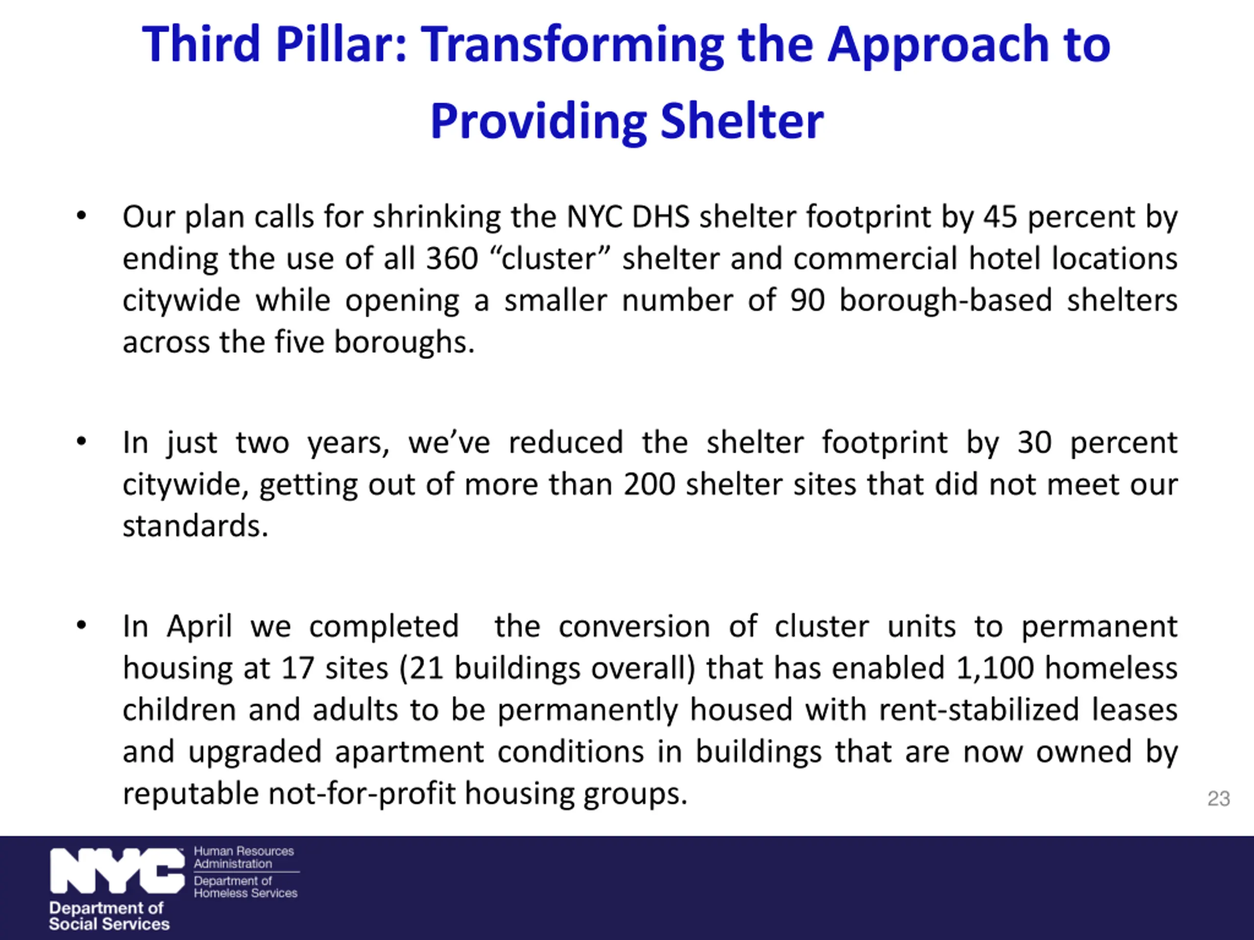 Third Pillar: Transforming the Approach to Providing Shelter Our plan calls for shrinking the NYC DHS shelter footprint by 45 percent by ending the use of all 360 cluster shelter and commercial hotel locations citywide while opening a smaller number of 90 borough-based shelters across the five boroughs. In just two years, we ve reduced the shelter footprint by 30 percent citywide, getting out of more than 200 shelter sites that did not meet our standards. In April we completed the conversion of cluster units to permanent housing at 17 sites (21 buildings overall) that has enabled 1,100 homeless children and adults to be permanently housed with rent-stabilized leases and upgraded apartment conditions in buildings that are now owned by reputable not-for-profit housing groups. 23 23