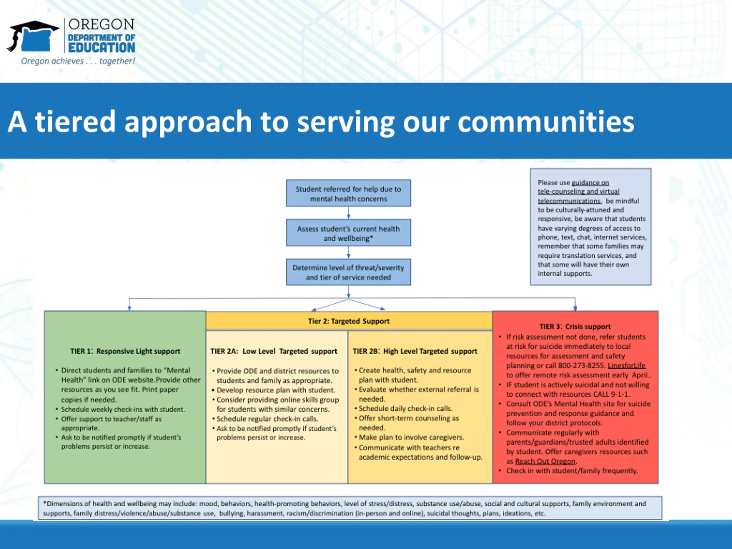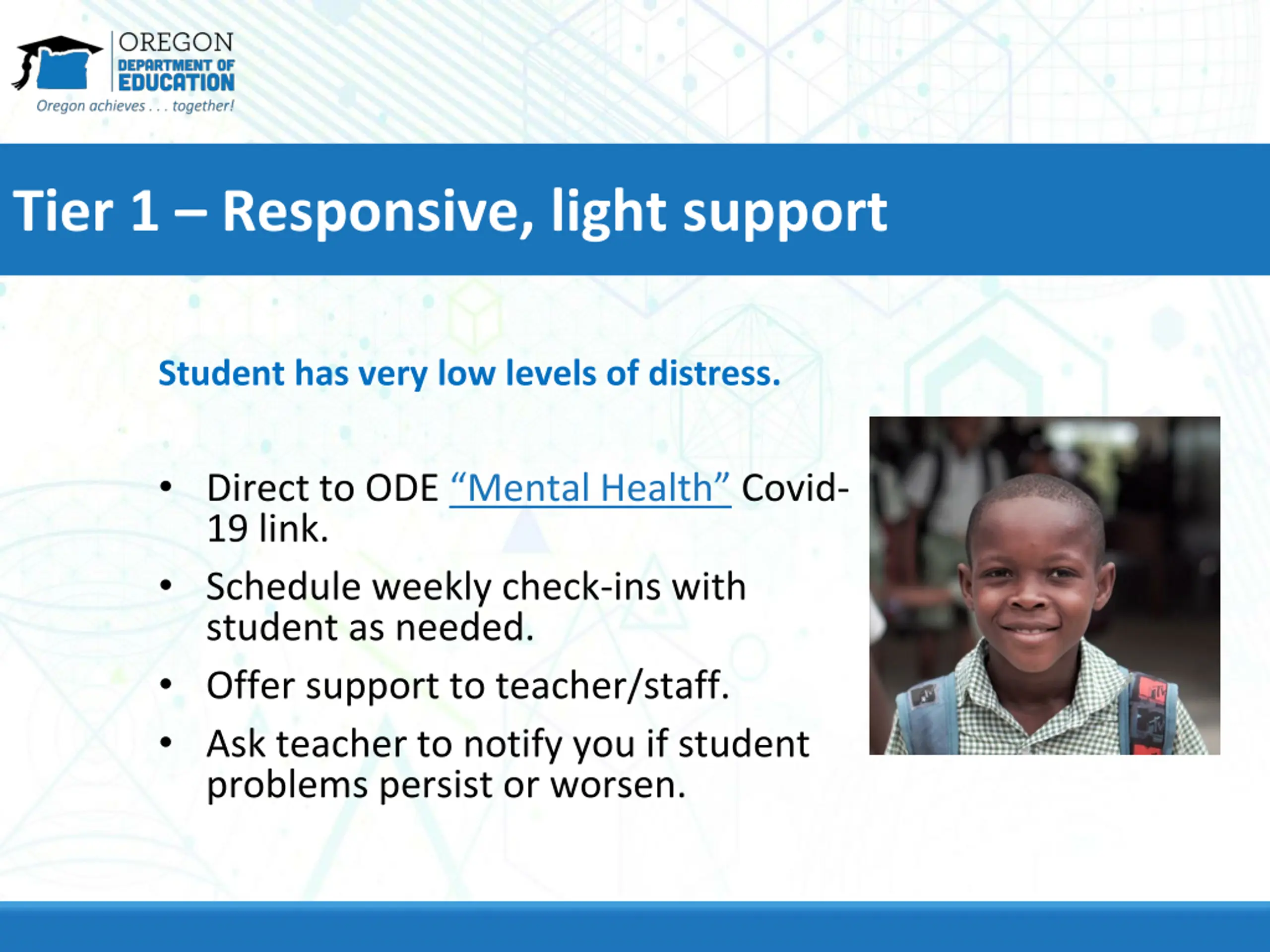 Tier 1 Responsive, light support Student has very low levels of distress. Direct to ODE Mental Health Covid- 19 link. Schedule weekly check-ins with student as needed. Offer support to teacher/staff. Ask teacher to notify you if student problems persist or worsen.