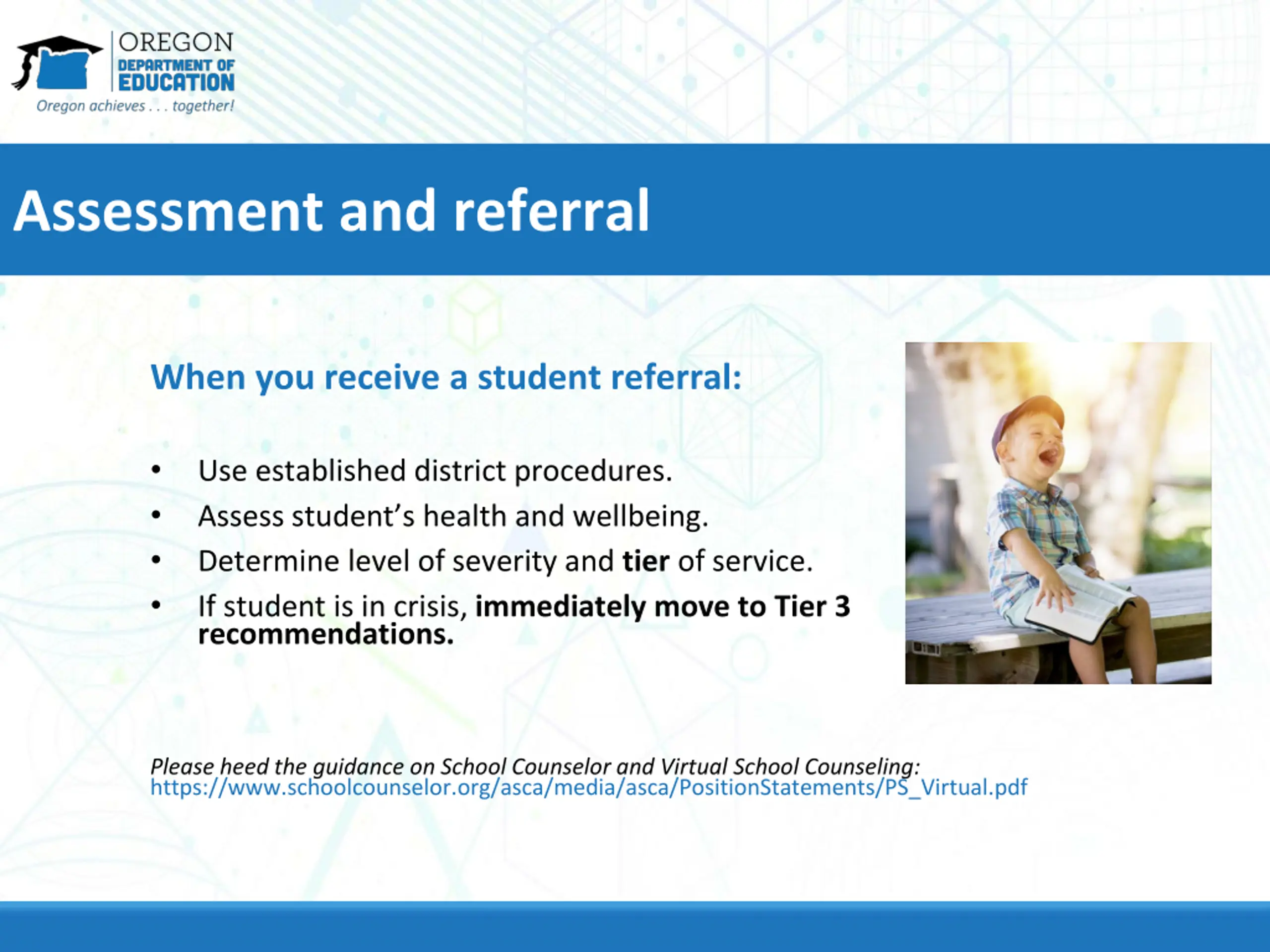 Assessment and referral When you receive a student referral: Use established district procedures. Assess student s health and wellbeing. Determine level of severity and tier of service. If student is in crisis, immediately move to Tier 3 recommendations. Please heed the guidance on School Counselor and Virtual School Counseling: https://www.schoolcounselor.org/asca/media/asca/PositionStatements/PS_Virtual.pdf